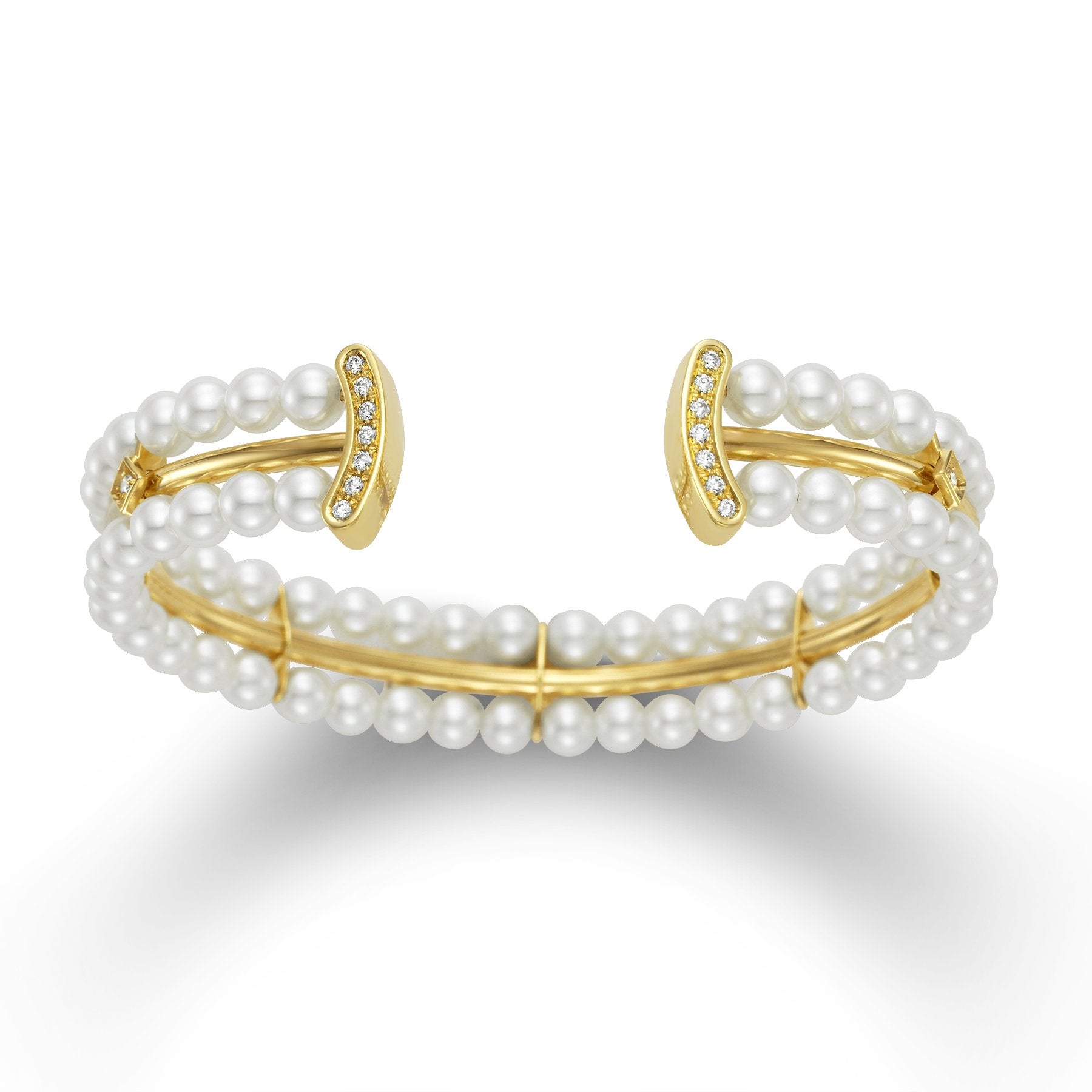 This lovely Sorrento Decades Cuff Bracelet is a 18KT Yellow Gold 4.5-5MM White Akoya Pearl Bracelet with 21 Diamonds 0.35 TCW and is apart of our Mastoloni Collection. Our Mastoloni collection of jewelry includes bracelets, rings, necklaces, and earrings.