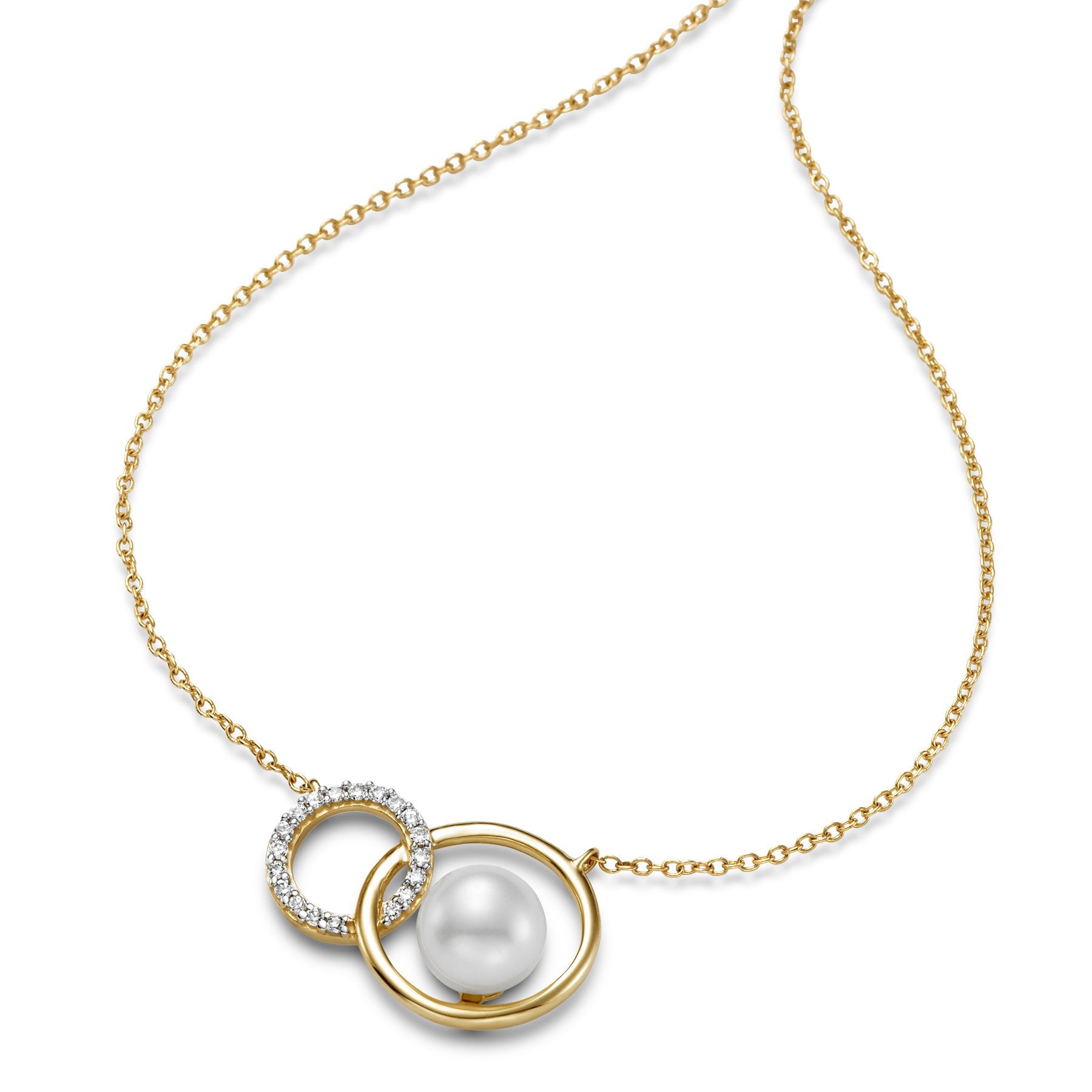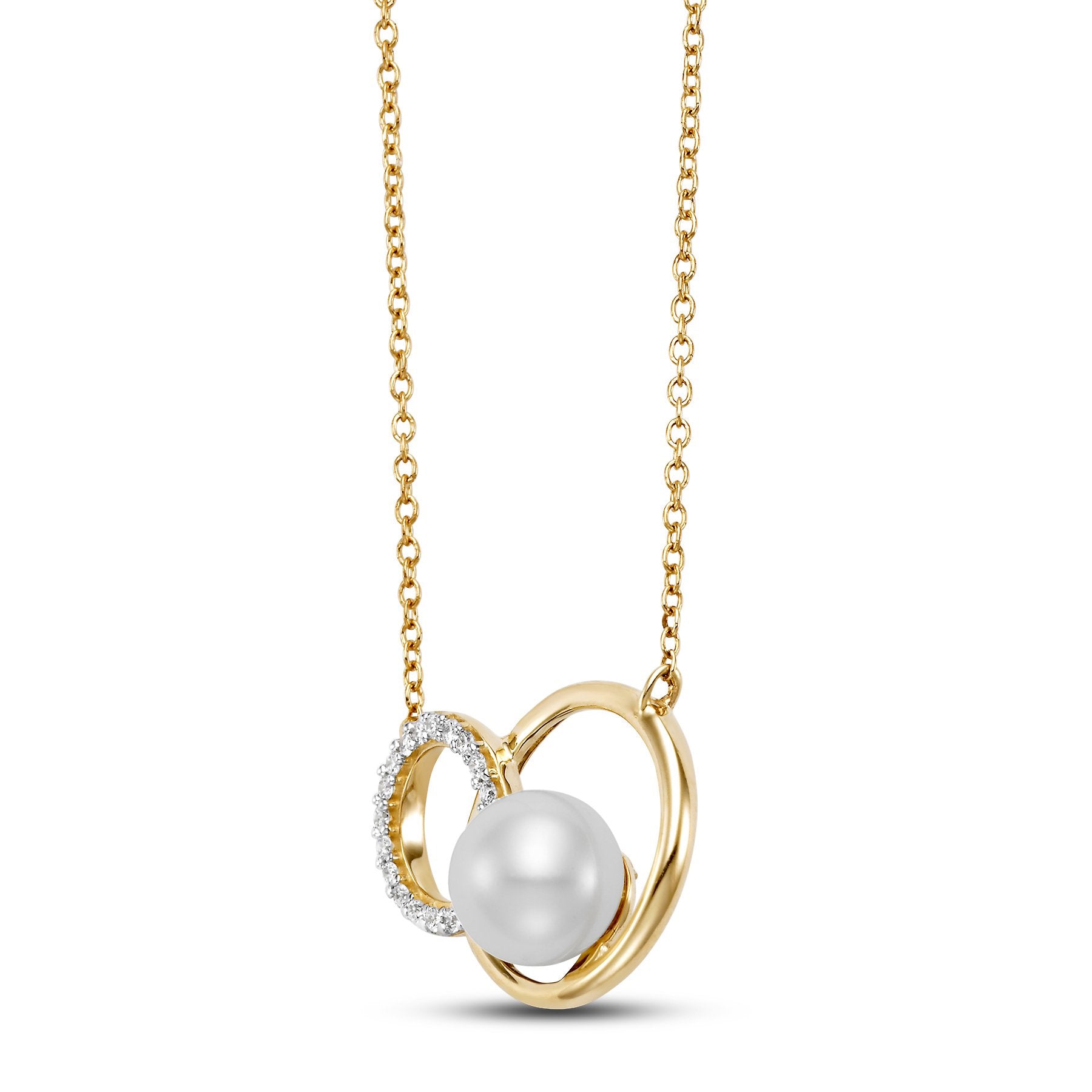 This lovely Circles Pendant Necklace is a 14KT Yellow Gold 6.5-7MM White Freshwater Pearl Necklace with 19 Diamonds 0.10 TCW, 18 Inches and is apart of our Mastoloni Collection. Our Mastoloni collection of jewelry includes bracelets, rings, necklaces, and earrings.