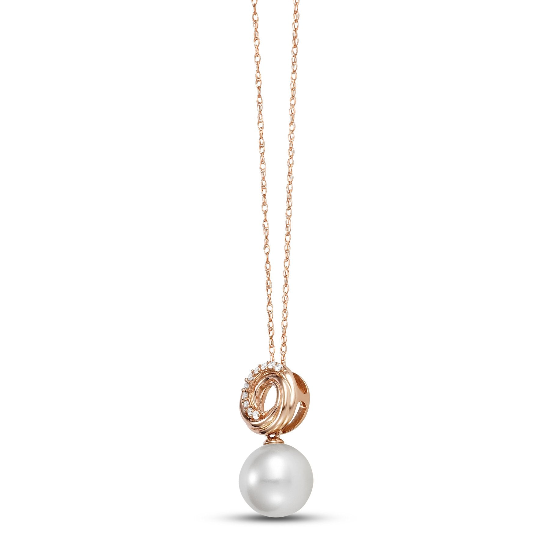 This lovely Double Circle Pendant is a 14KT Rose Gold 8.5-9MM White Freshwater Pearl Pendant with 10 Diamonds 0.05 TCW, 18 Inch Chain and is apart of our Mastoloni Collection. Our Mastoloni collection of jewelry includes bracelets, rings, necklaces, and earrings.