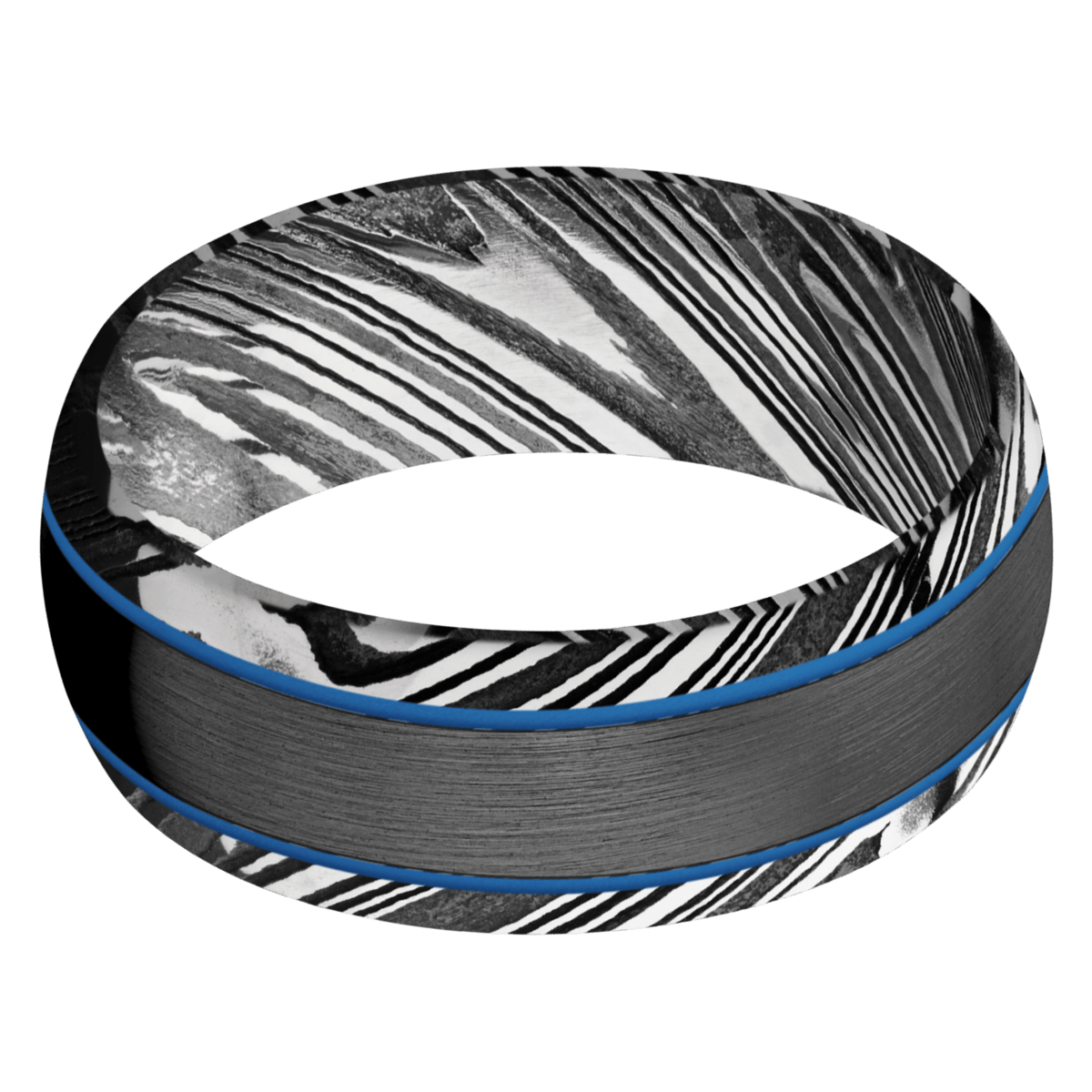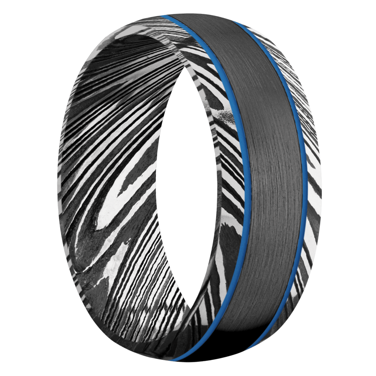Product Description: 8mm Woodgrain Damascus Steel Band With 5mm Black Zirconium & Sea Blue Cerakote Accents.