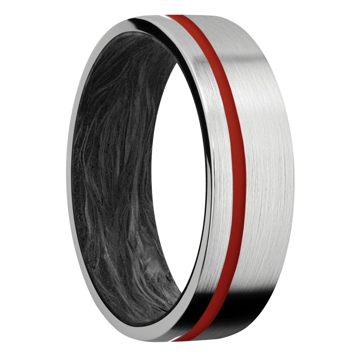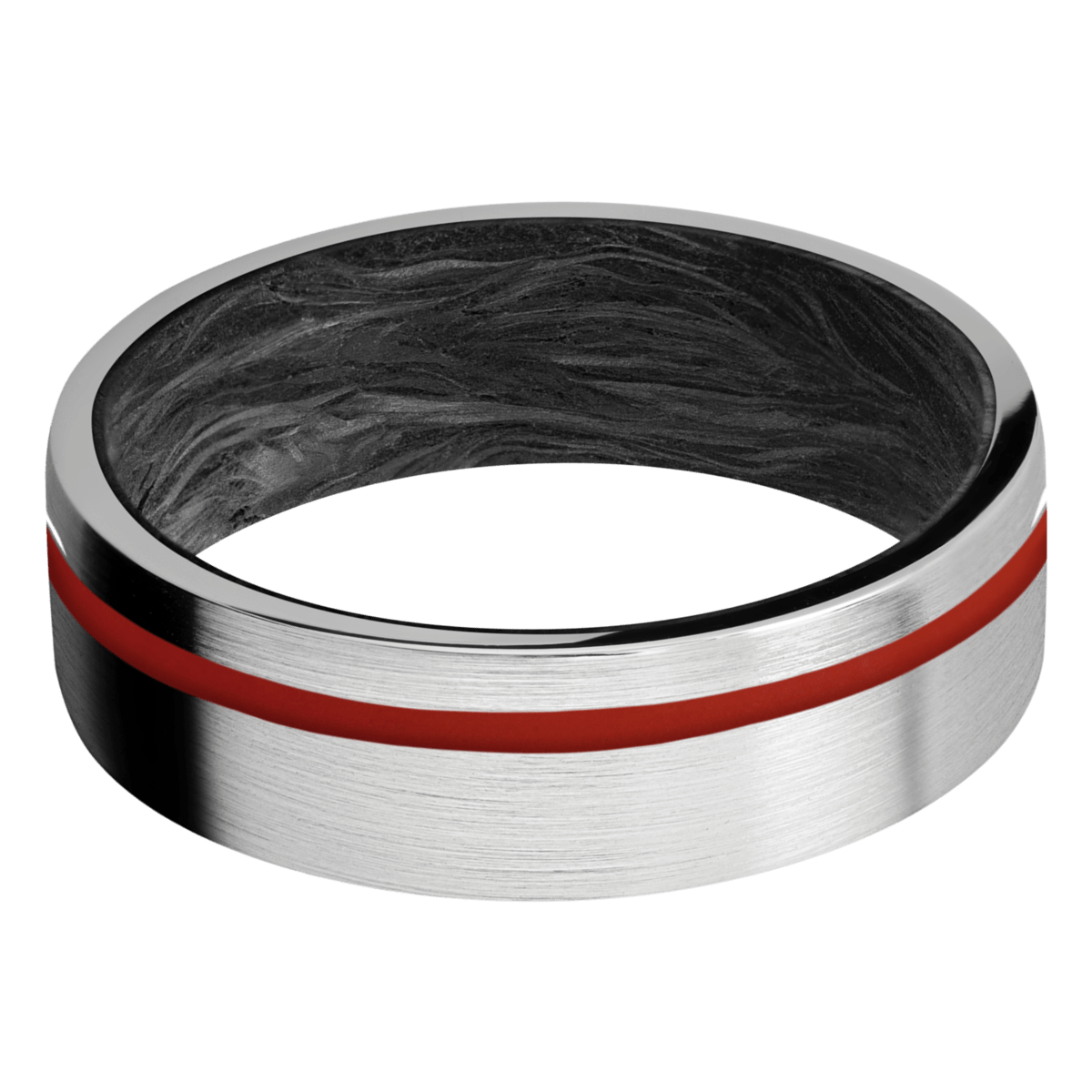 Product Description: 7mm Titanium Bands With Red Apple Cerakote Inlay And Forged Carbon Fiber Sleeve.
