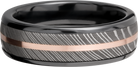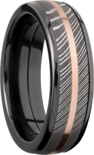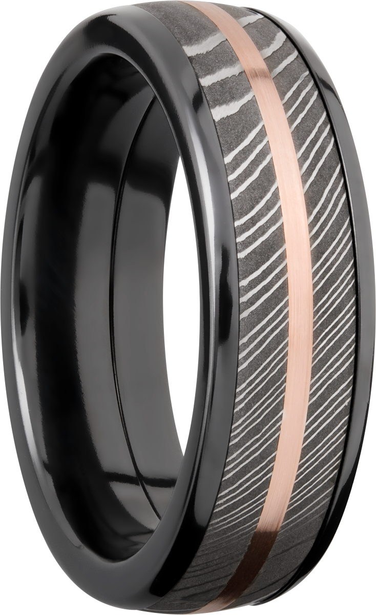 Product Description: 7mm Black Zirconium Band With 5mm Damascus Steel With 1mm14Krg.