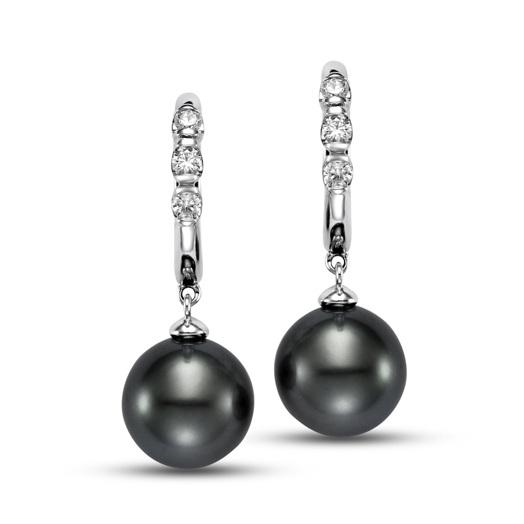 This lovely Hoop Drop Earrings is a 14KT White Gold 8.5-9MM Black Tahitian Pearl Hoop Drop Earrings with 6 Diamonds 0.144 TCW and is apart of our Mastoloni Collection. Our Mastoloni collection of jewelry includes bracelets, rings, necklaces, and earrings.