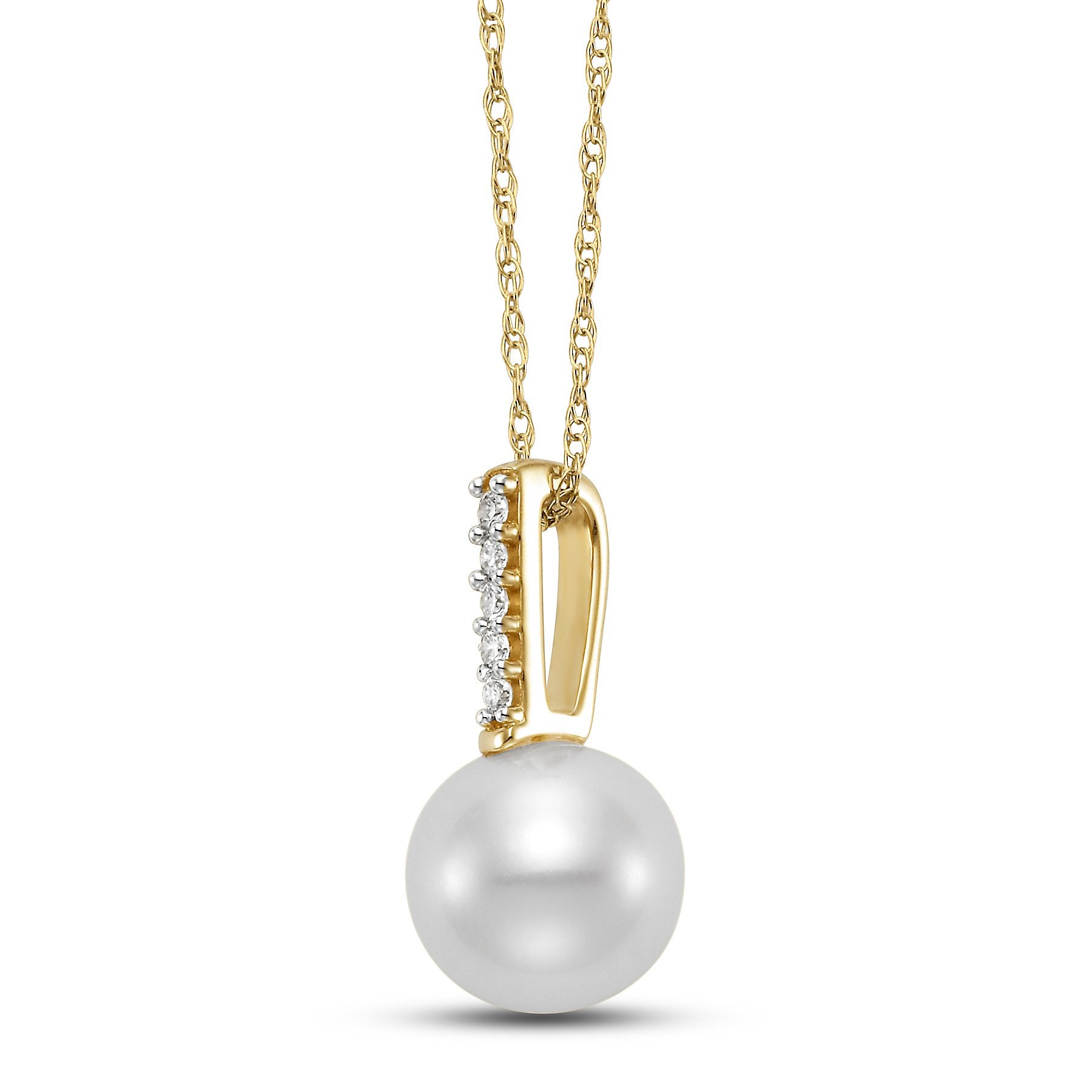 This lovely Classic Drop Pendant is a 14KT Yellow Gold 7.5-8MM White Freshwater Pearl Pendant with 5 Diamonds 0.04 TCW, 18 Inch Chain and is apart of our Mastoloni Collection. Our Mastoloni collection of jewelry includes bracelets, rings, necklaces, and earrings.