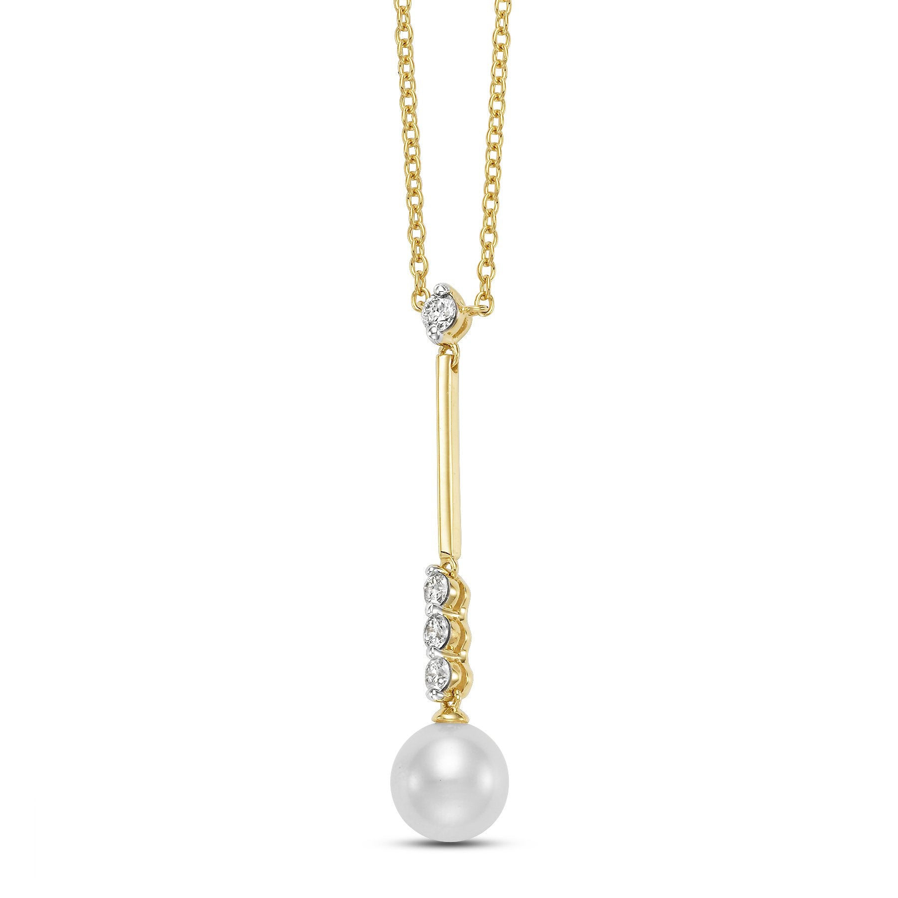This lovely Drop Pendant Necklace is a 18KT Yellow Gold 9-9.5MM White Freshwater Pearl Necklace with 4 Diamonds 0.34 TCW, 18 Inches and is apart of our Mastoloni Collection. Our Mastoloni collection of jewelry includes bracelets, rings, necklaces, and earrings.