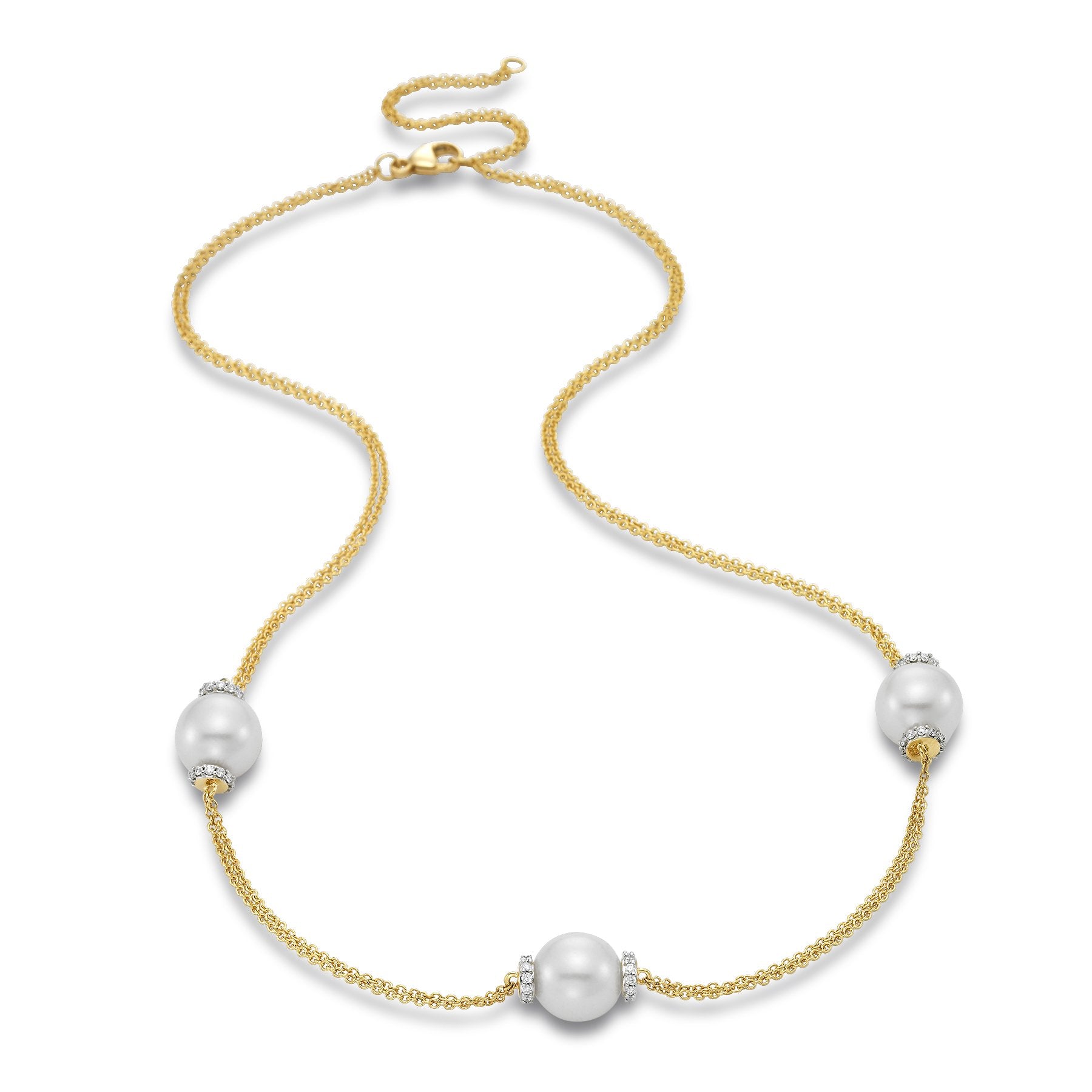 This lovely Three Pearl Station Necklace is a 18KT Yellow Gold 9-9.5MM White Freshwater Pearl Necklace with 66 Diamonds 0.35 TCW, 18 Inches and is apart of our Mastoloni Collection. Our Mastoloni collection of jewelry includes bracelets, rings, necklaces, and earrings.