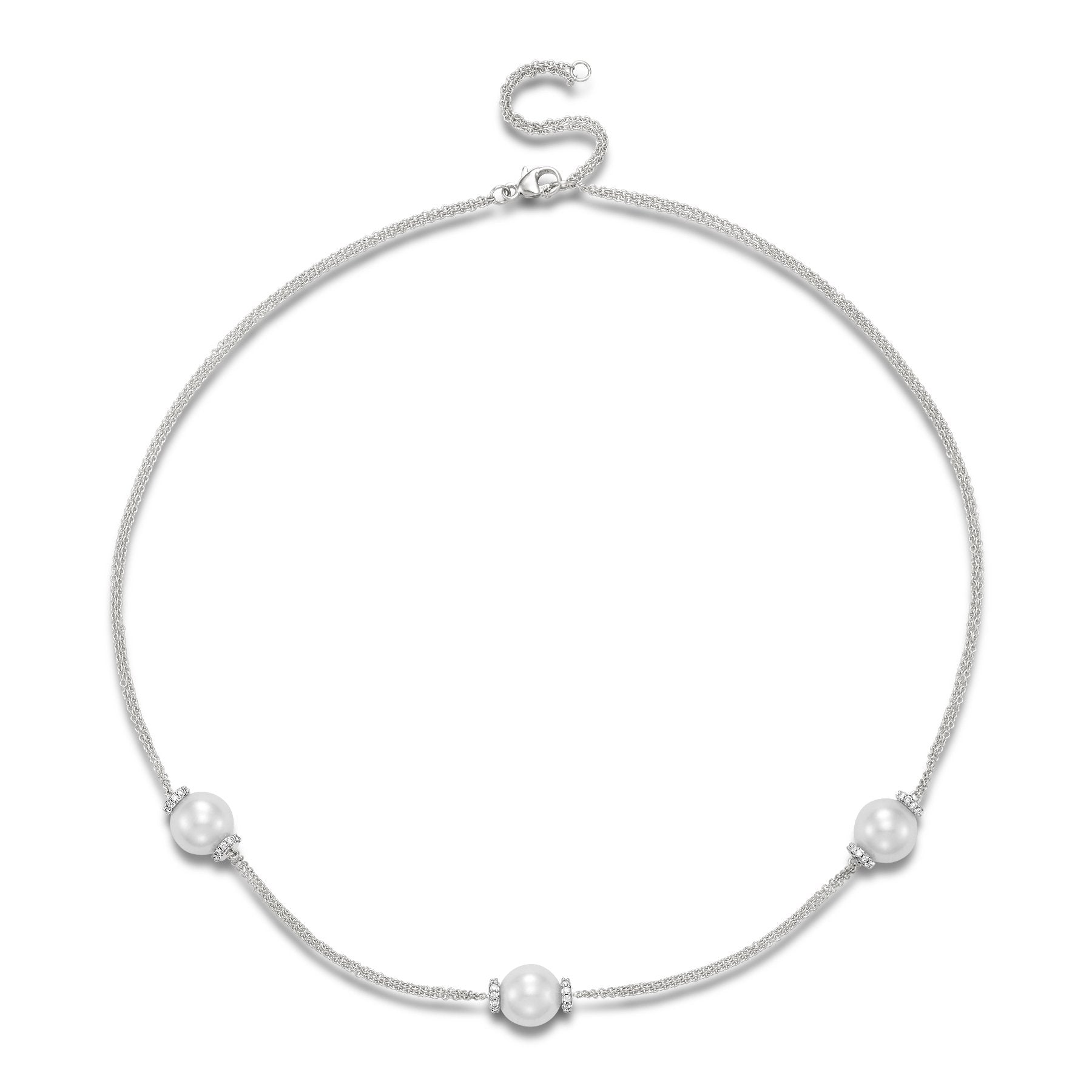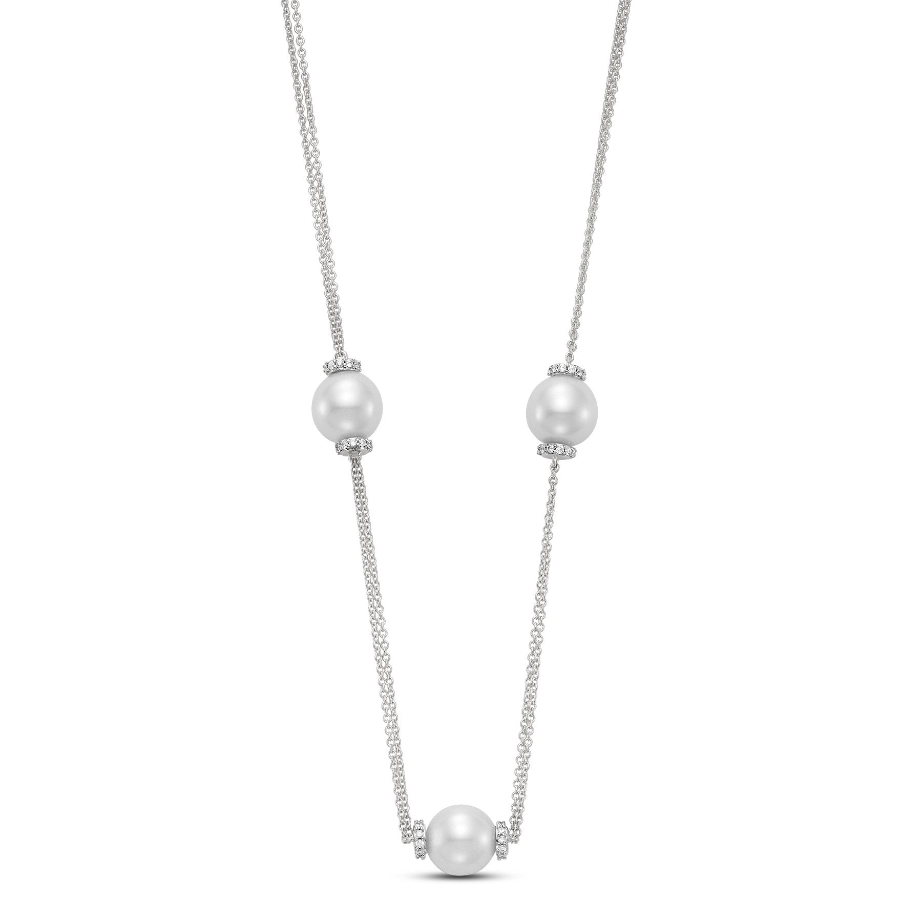 This lovely Three Pearl Station Necklace is a 18KT White Gold 9-9.5MM White Freshwater Pearl Necklace with 66 Diamonds 0.35 TCW, 18 Inches and is apart of our Mastoloni Collection. Our Mastoloni collection of jewelry includes bracelets, rings, necklaces, and earrings.