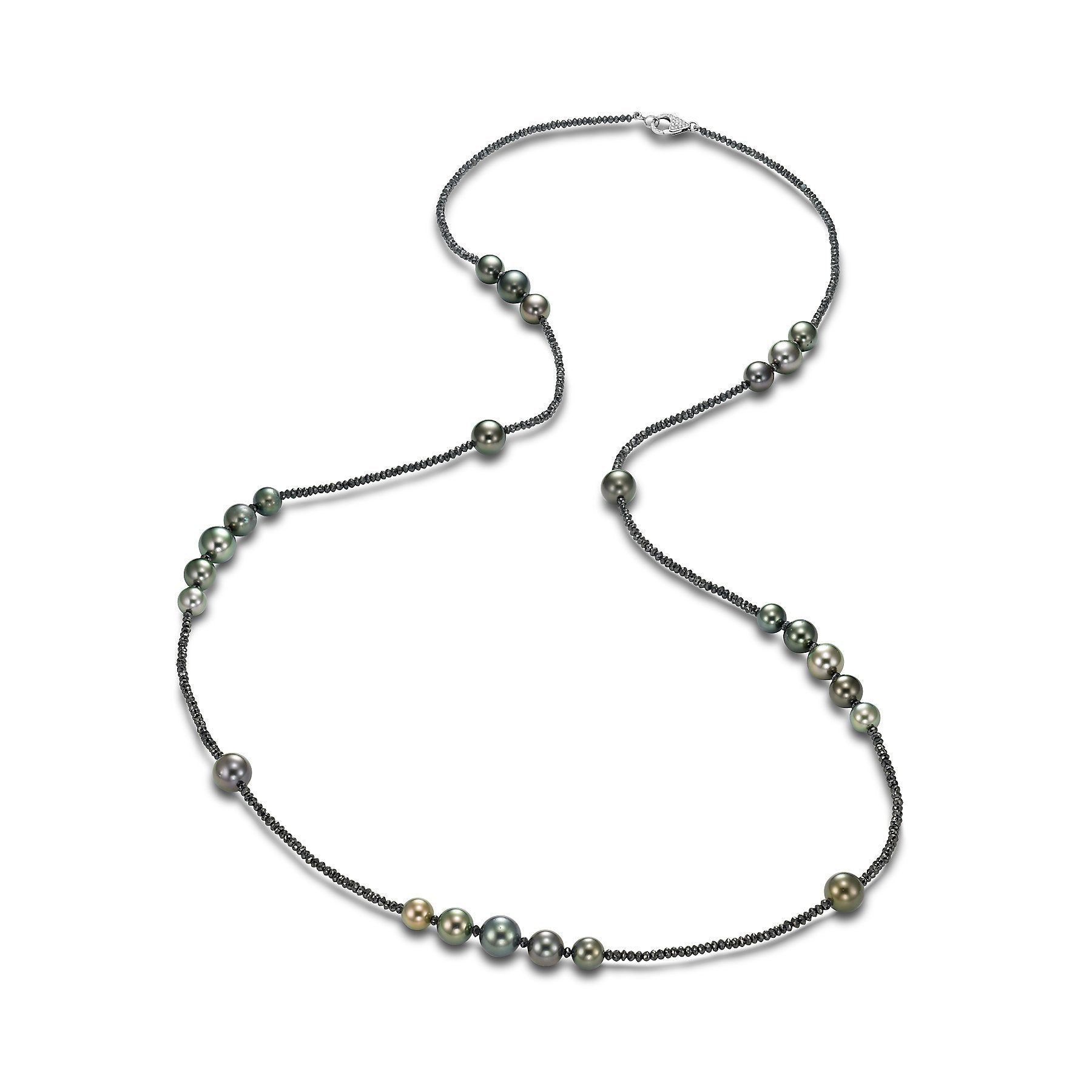 This lovely Ice Tahitian Pearl Dana Necklace is a 18KT White Gold 9-11MM Multicolor Black Tahitian Pearl Necklace with Black & White Diamonds 65.39 TCW, 42 Inches and is apart of our Mastoloni Collection. Our Mastoloni collection of jewelry includes bracelets, rings, necklaces, and earrings.