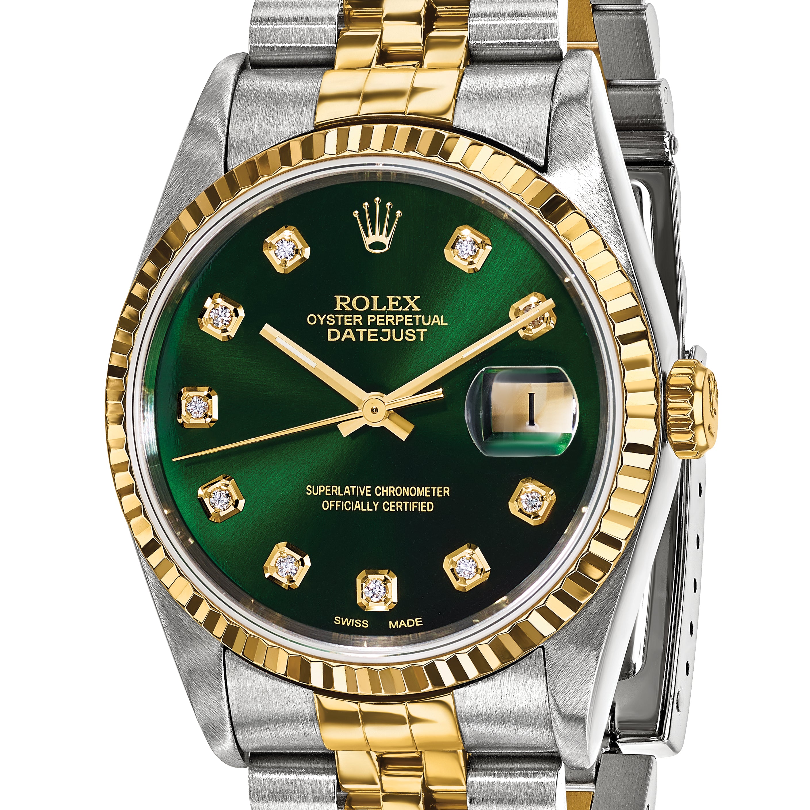 Swiss CrownT USA Pre-owned Rolex-Independently Certified Steel and 18k 36mm Jubilee Datejust Green Diamond Dial and Fluted Bezel Watch