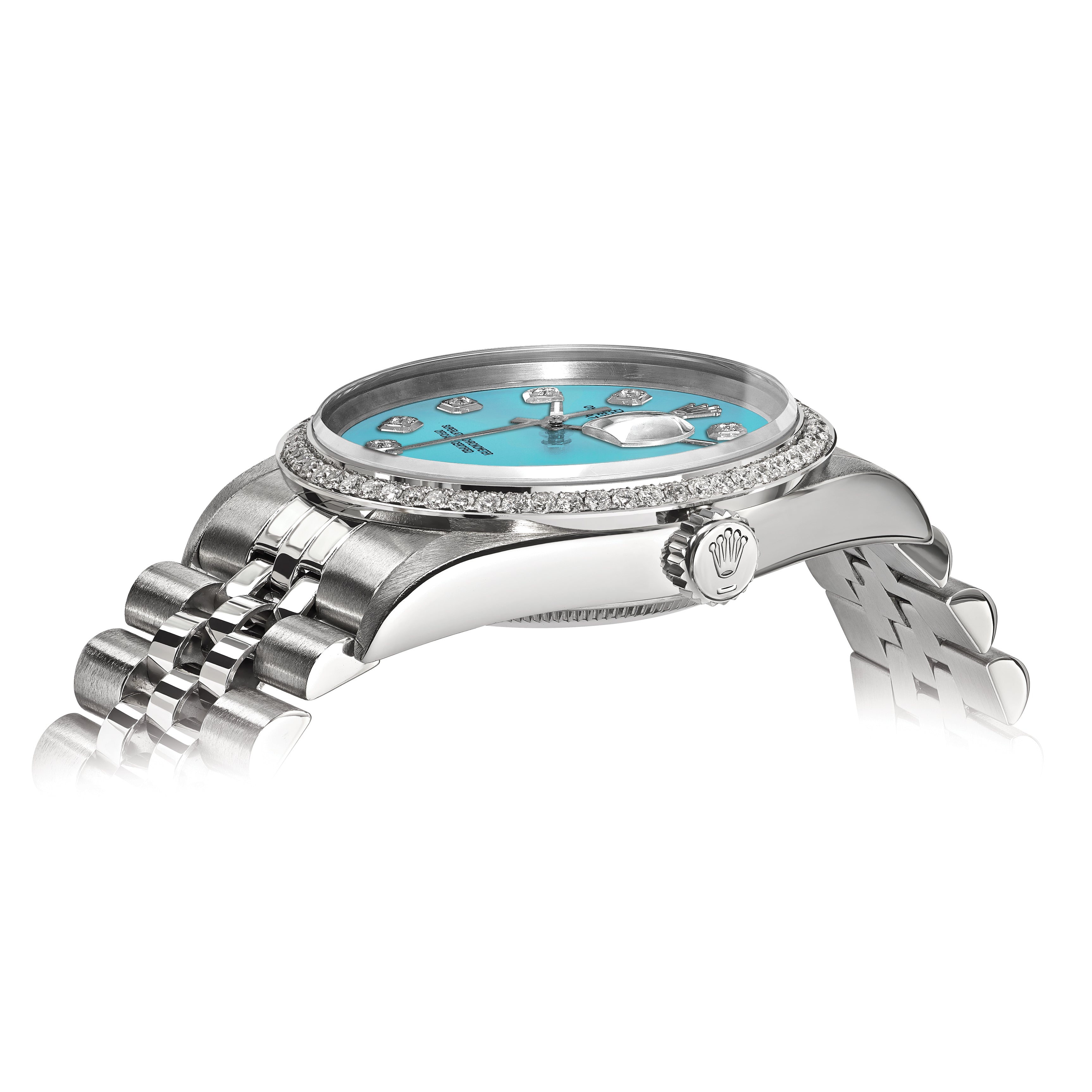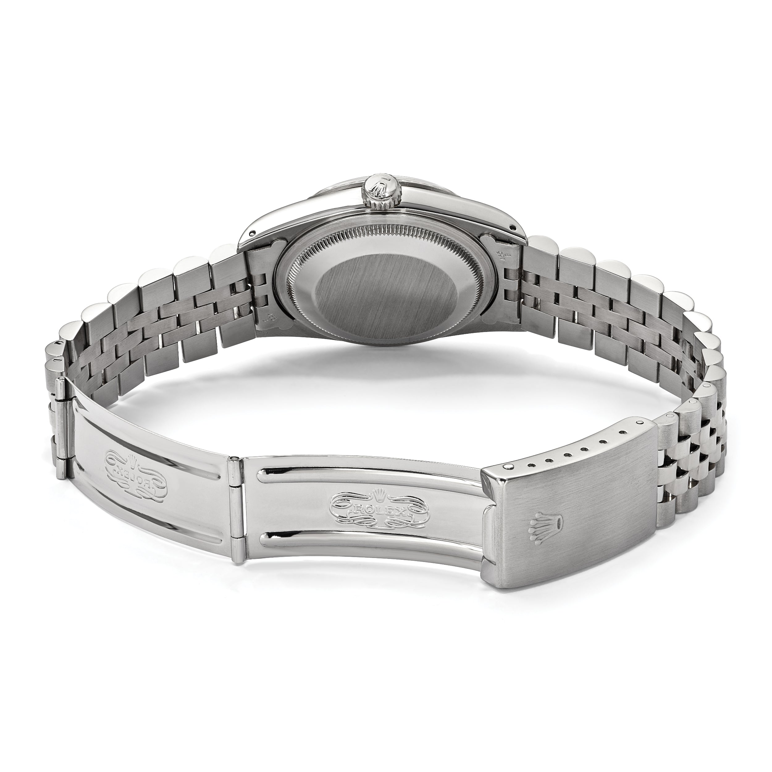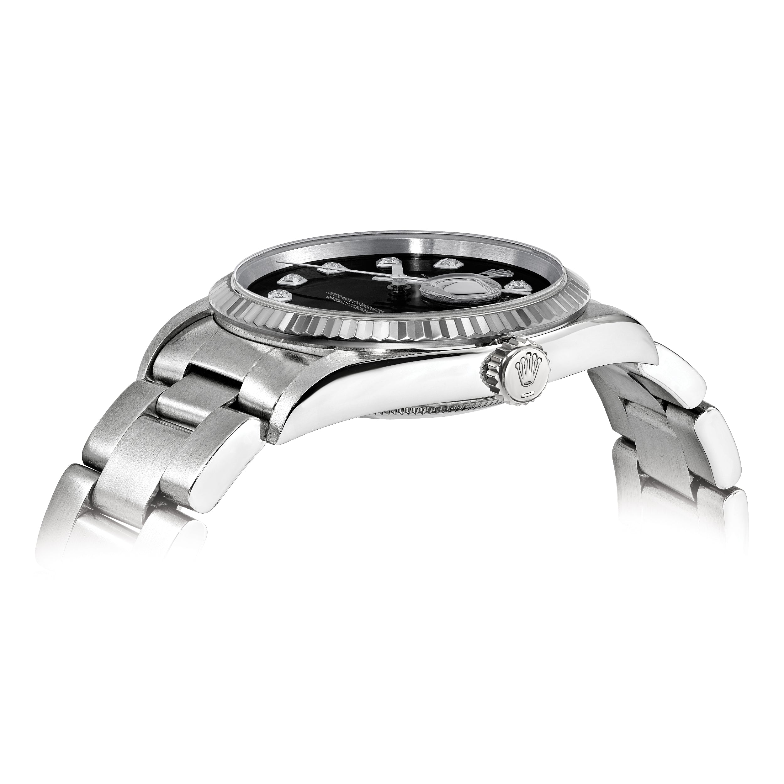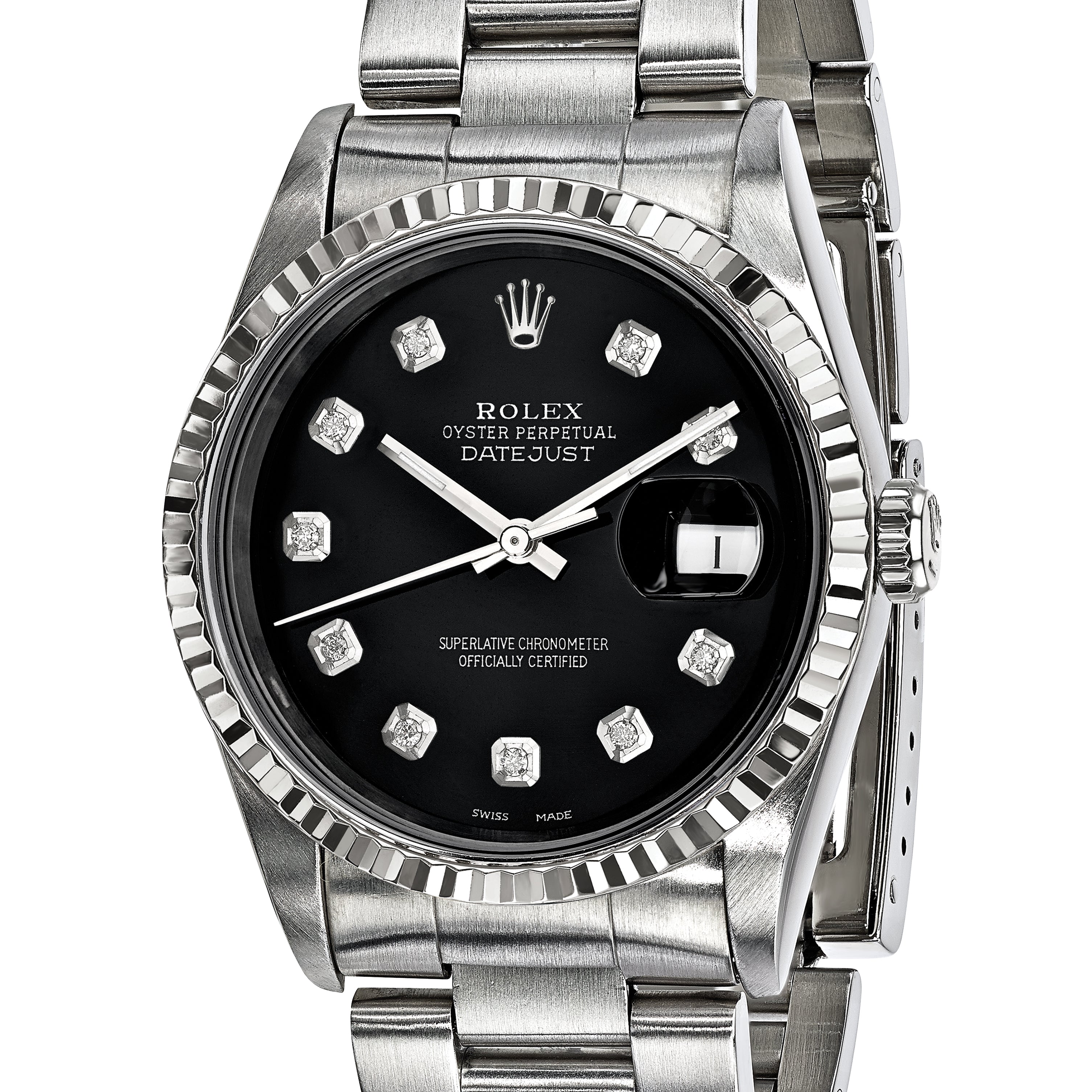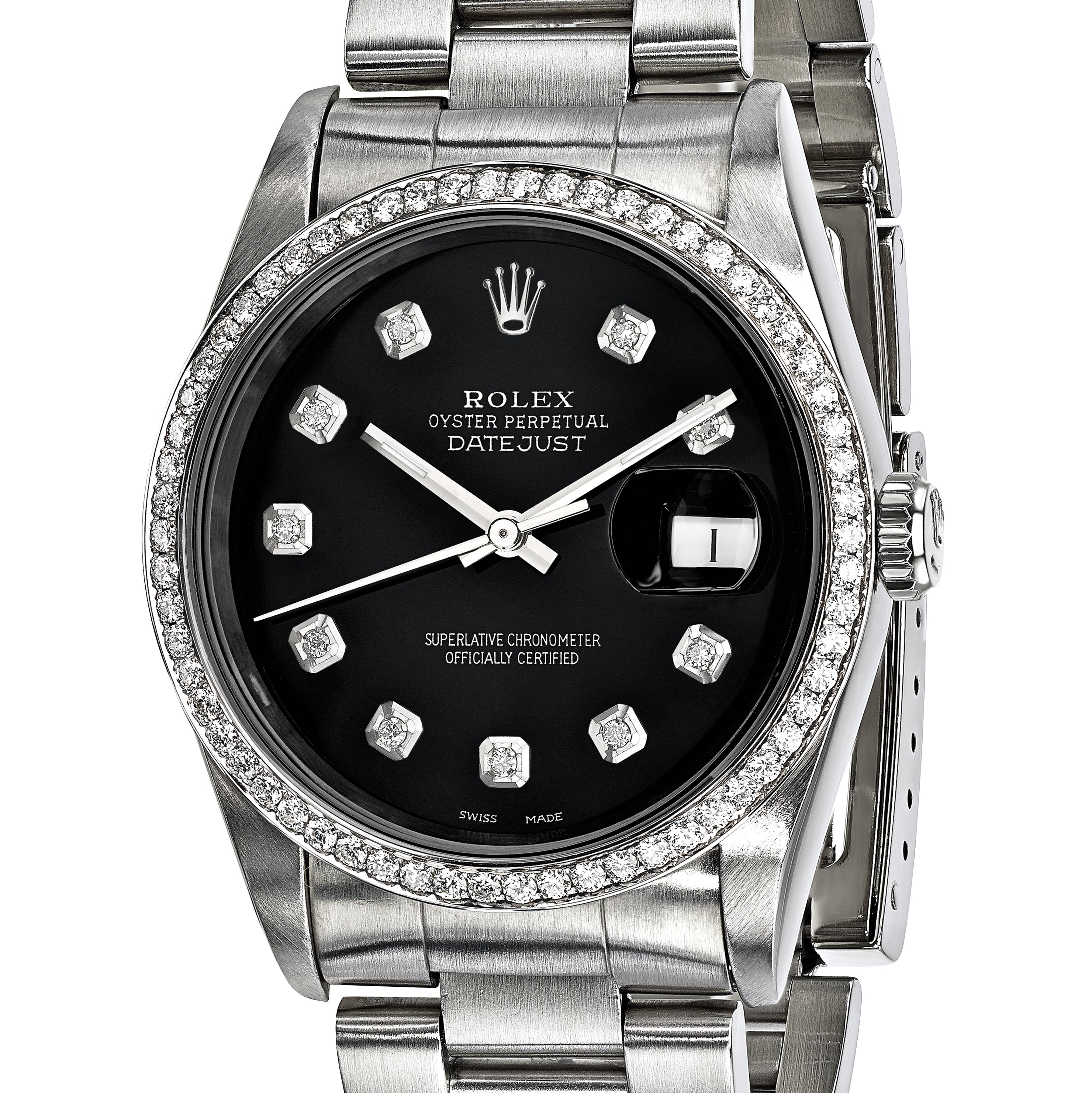 By turns dazzling and exacting, this 36-mm Oyster Perpetual Datejust features an ink-black dial, diamond hour markers, and a diamond and 14K white gold bezel. A polished and brushed stainless steel jubilee bracelet lends classic flair to a stainless steel case that houses a high-precision Swiss-made automatic movement. Adjust the quickset date function with the screw-down, stainless steel crown and enjoy the timeless elegance of this luxurious evening timepiece.