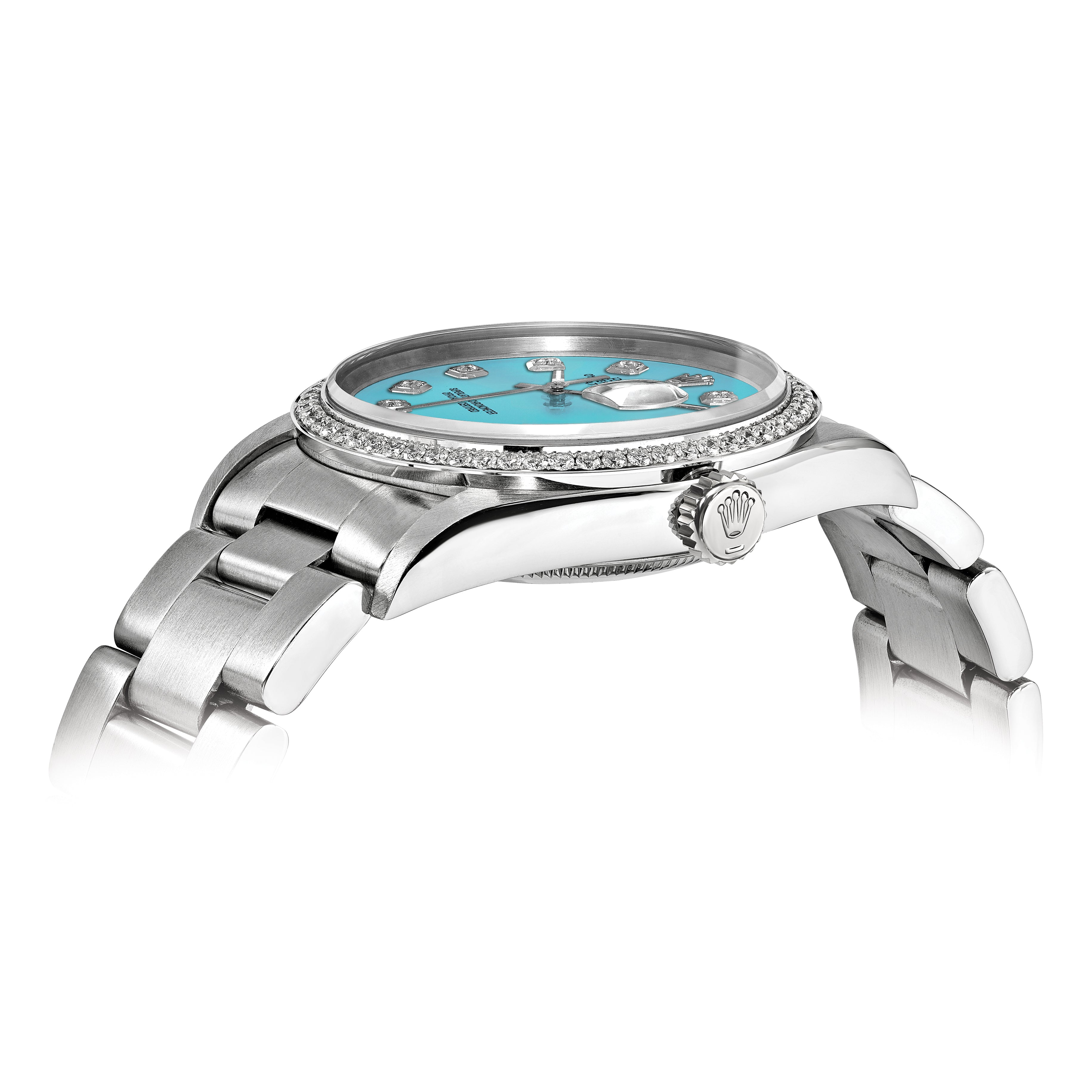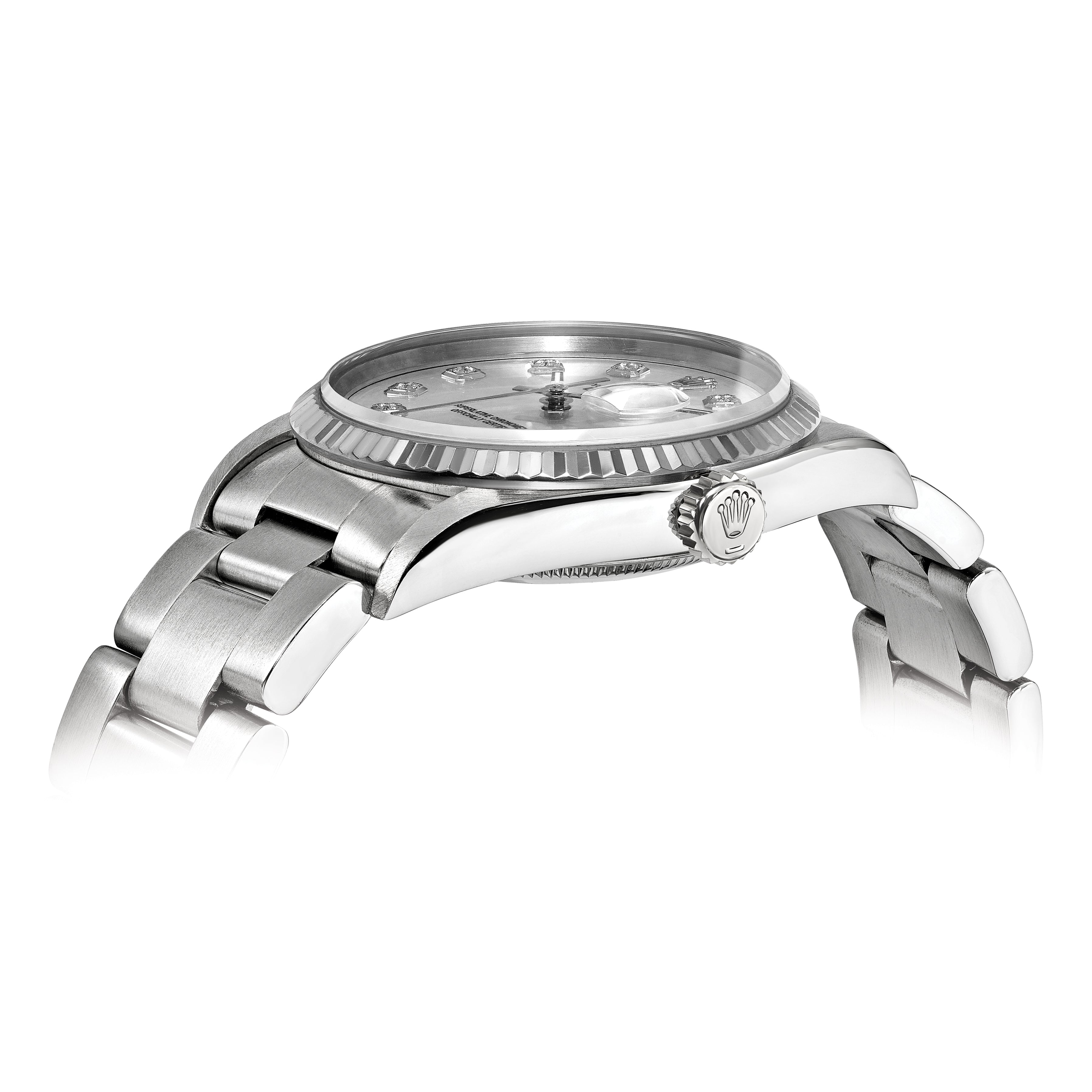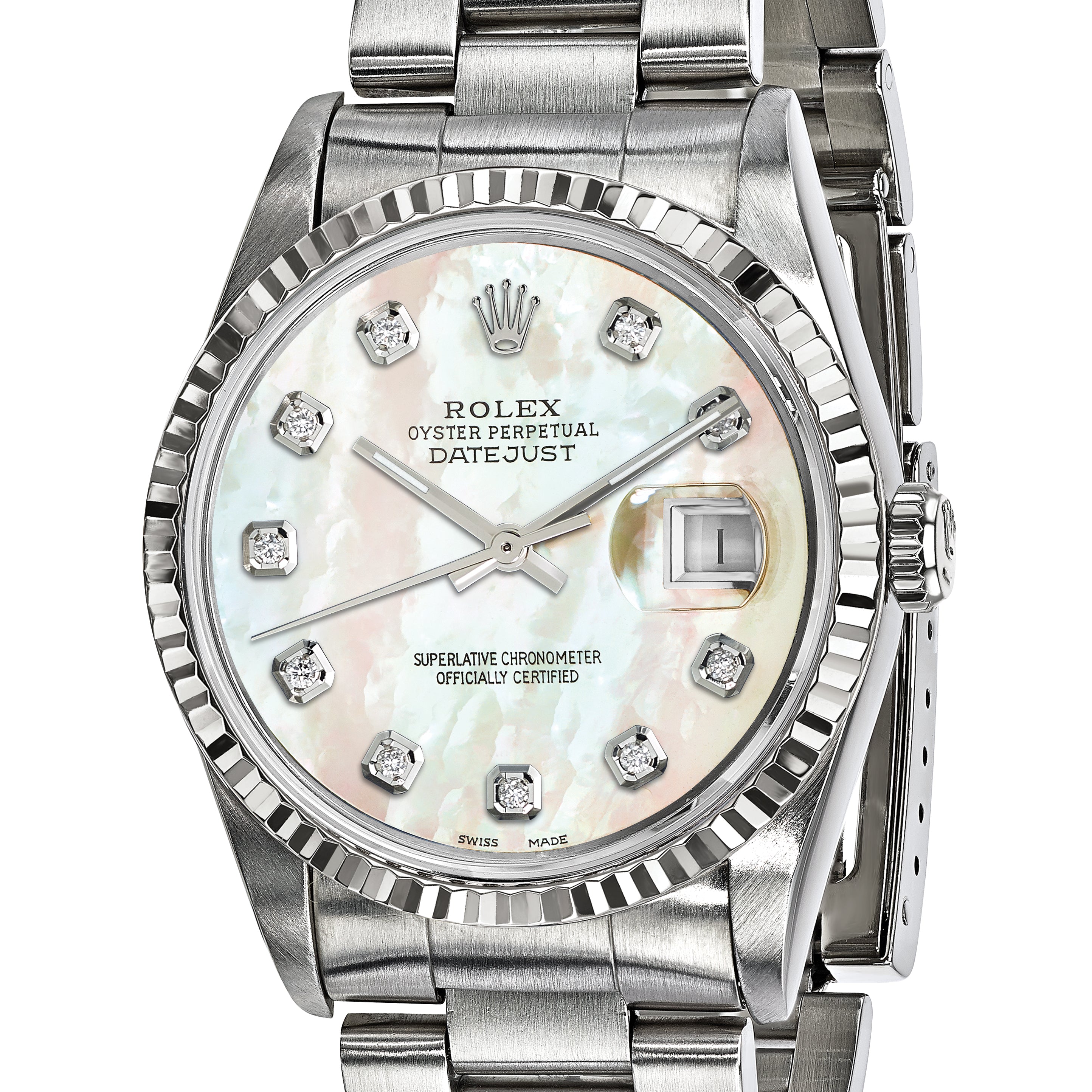 For cool brilliance with subtle flash, choose this 36-mm Oyster Perpetual Datejust with a stainless steel jubilee bracelet. Its 14K white gold and diamond bezel make a sparkling complement to the snow-white dial that marks the hours with ten icy diamonds. A stainless steel case protects a Swiss-made automatic movement, complete with a quickset date function that is easily accessed with the screw-down stainless-steel crown. With a polished and brushed finish, this silvery timepiece will add sensational flair to your wardrobe.
