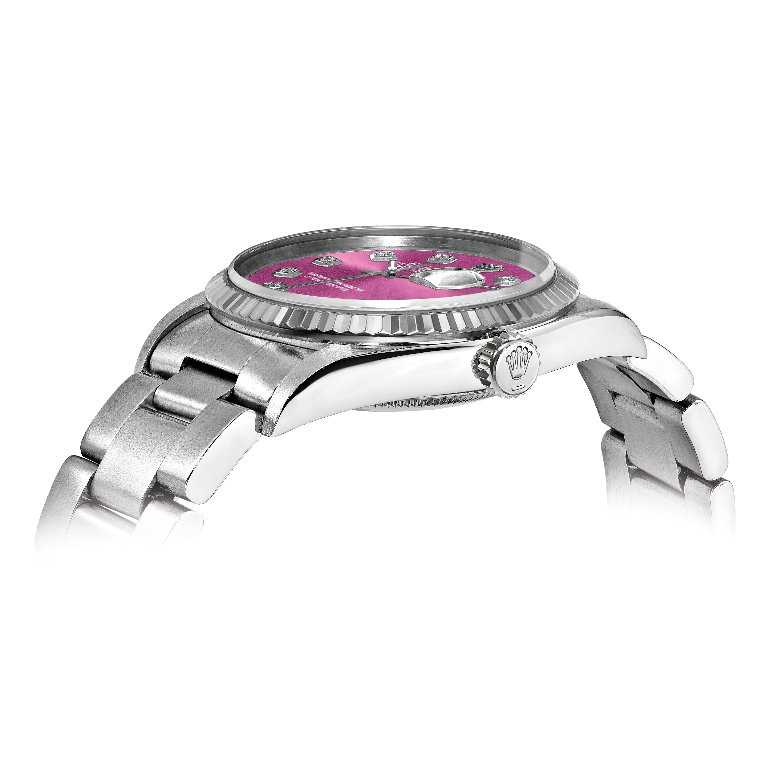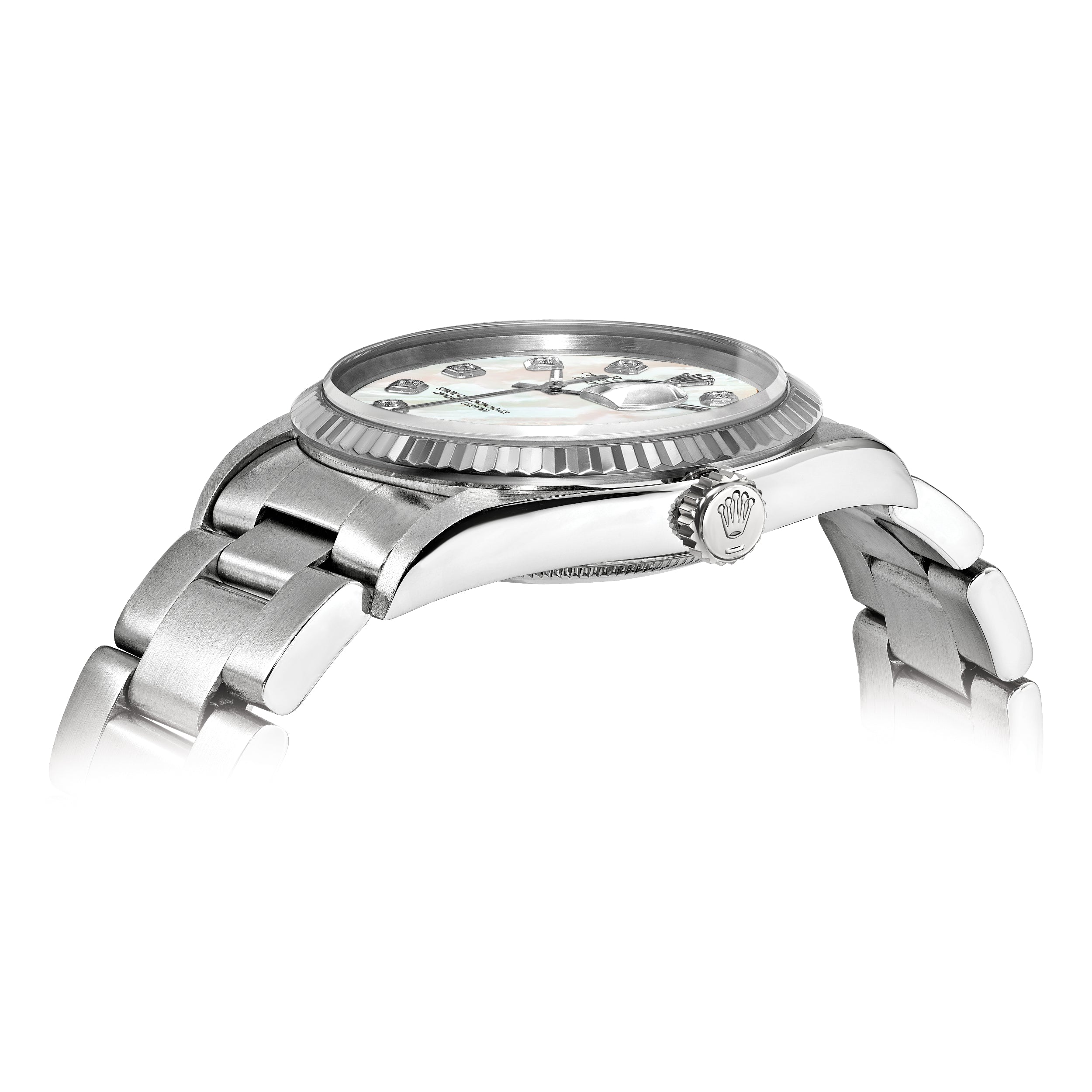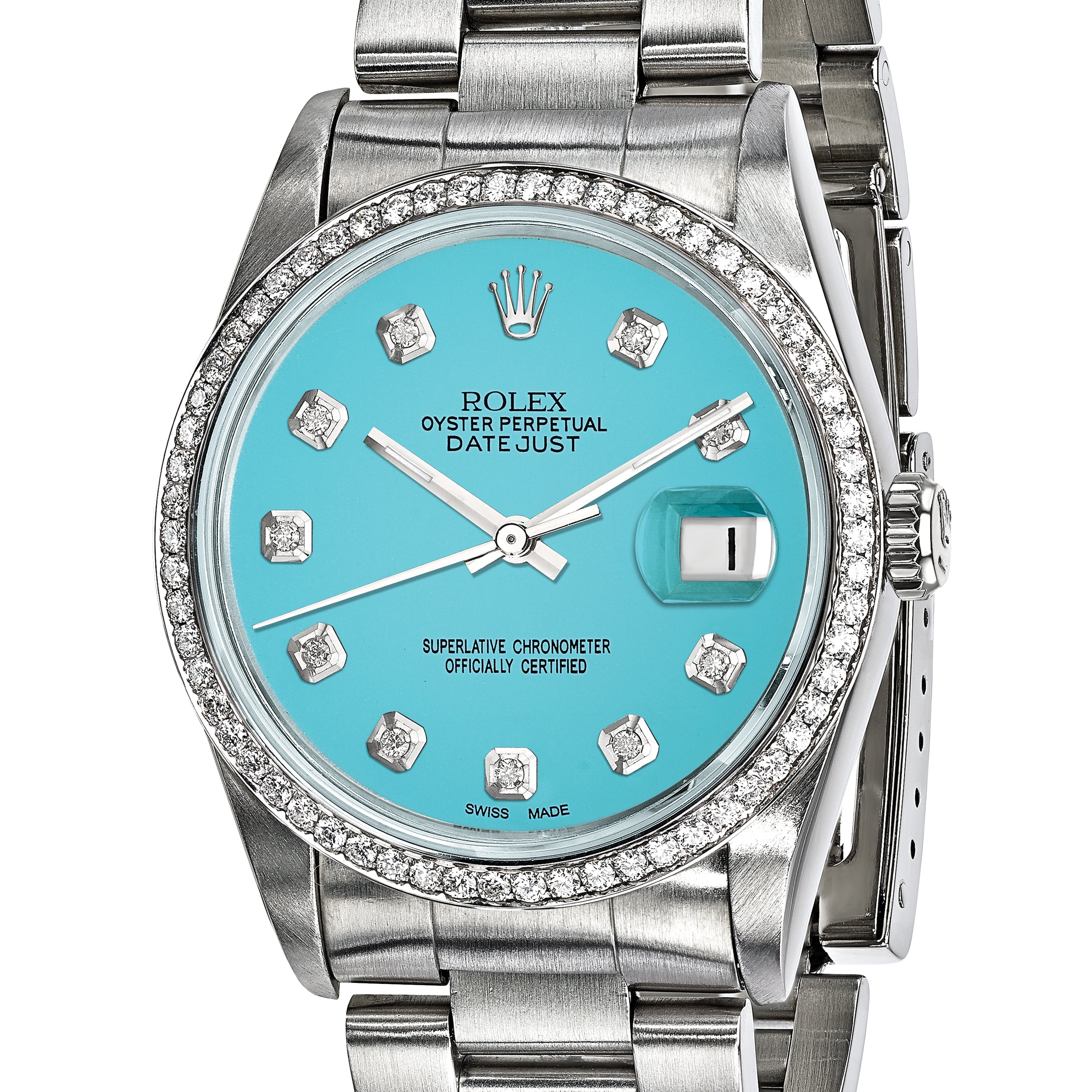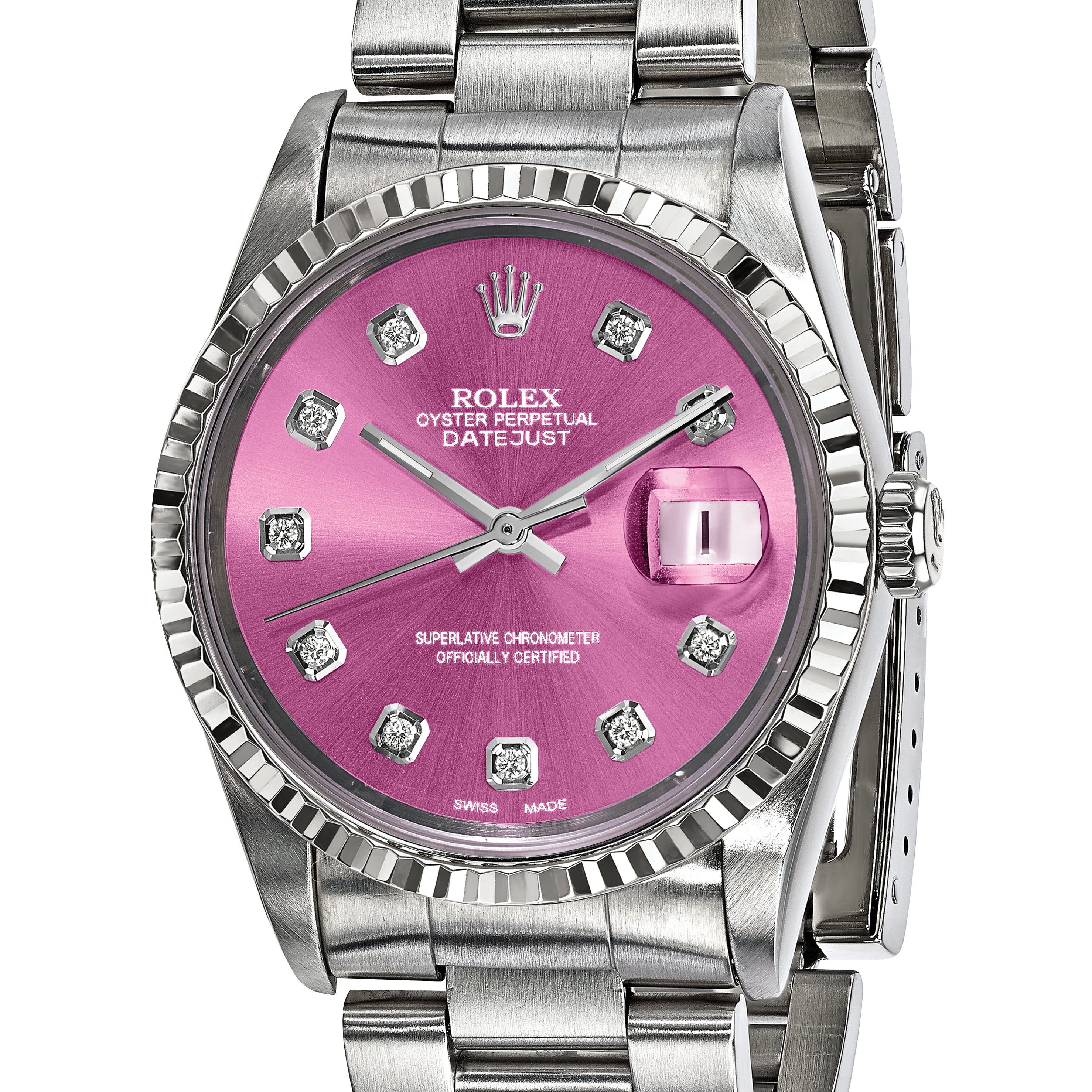 For cool brilliance with subtle flash, choose this 36-mm Oyster Perpetual Datejust with a stainless steel jubilee bracelet. Its 14K white gold and diamond bezel make a sparkling complement to the snow-white dial that marks the hours with ten icy diamonds. A stainless steel case protects a Swiss-made automatic movement, complete with a quickset date function that is easily accessed with the screw-down stainless-steel crown. With a polished and brushed finish, this silvery timepiece will add sensational flair to your wardrobe.