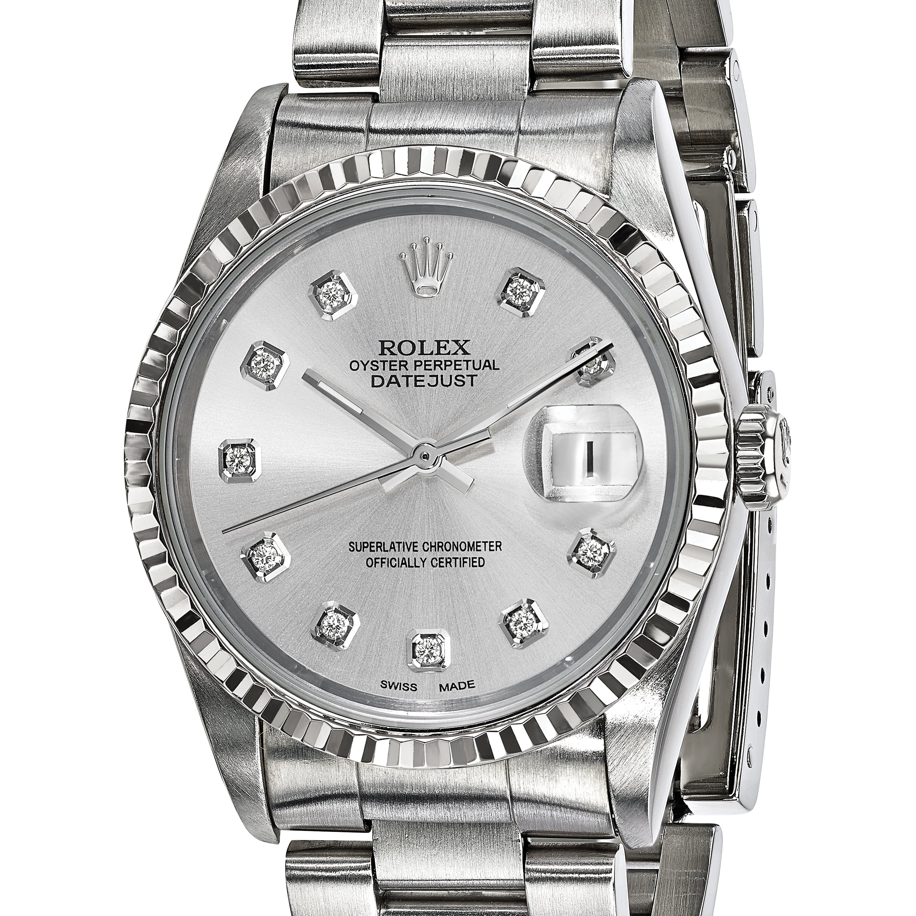 Pre-owned Independently Certified Men's Stainless Steel Datejust Jubilee with Silver Diamond Dial and 18K Fluted Bezel