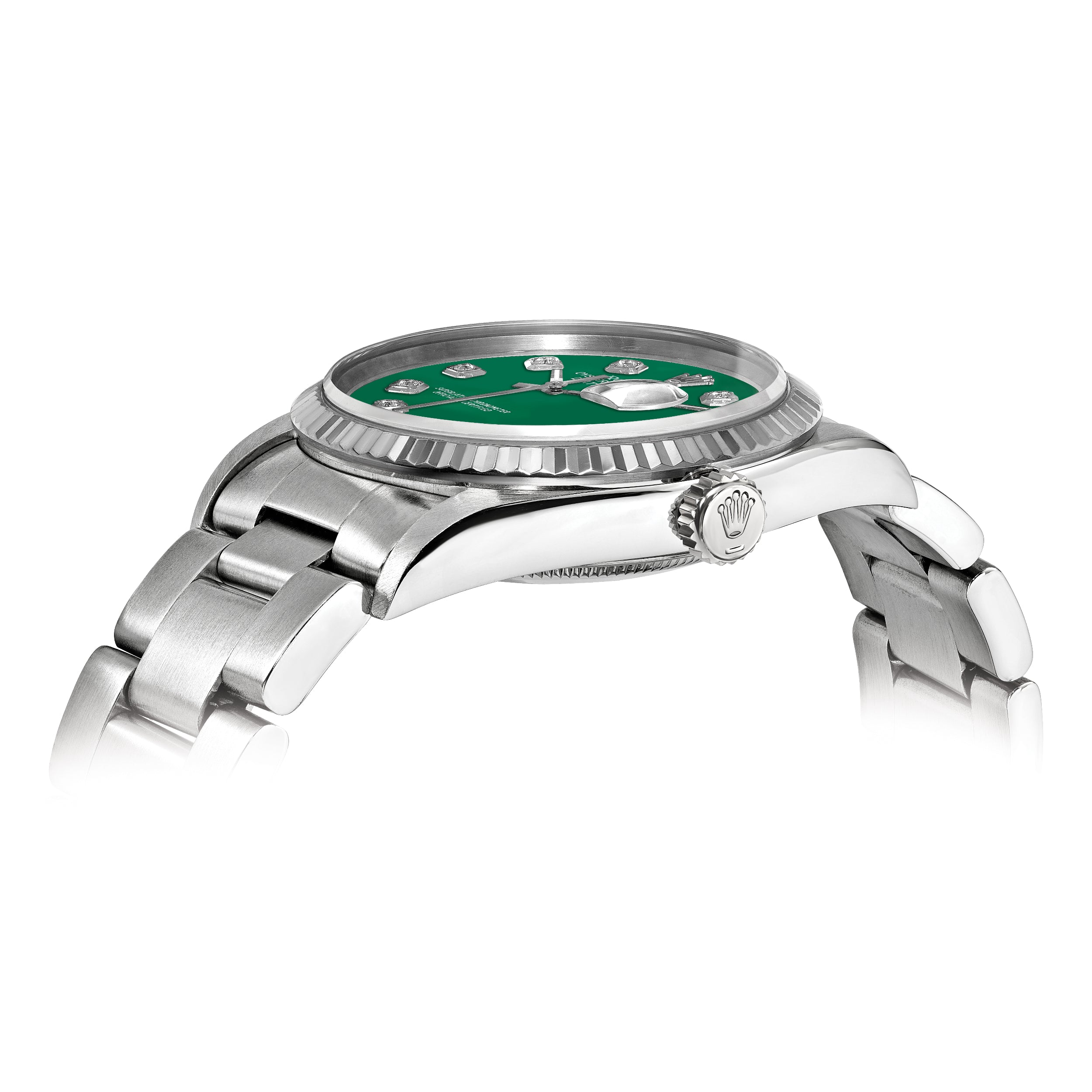Celebrate the best in life with this gorgeous 36-mm timepiece featuring an emerald-green sunray dial. This Oyster Perpetual Datejust is finished with diamond hour markers and a fluted 18K yellow gold bezel. The stainless steel and gold jubilee bracelet shines on your wrist. A Swiss-made automatic movement with quickset date function speaks to mechanical excellence, while the stainless steel case, 18K screw-down crown, and polished and brushed finish are emblems of its fine craftsmanship.