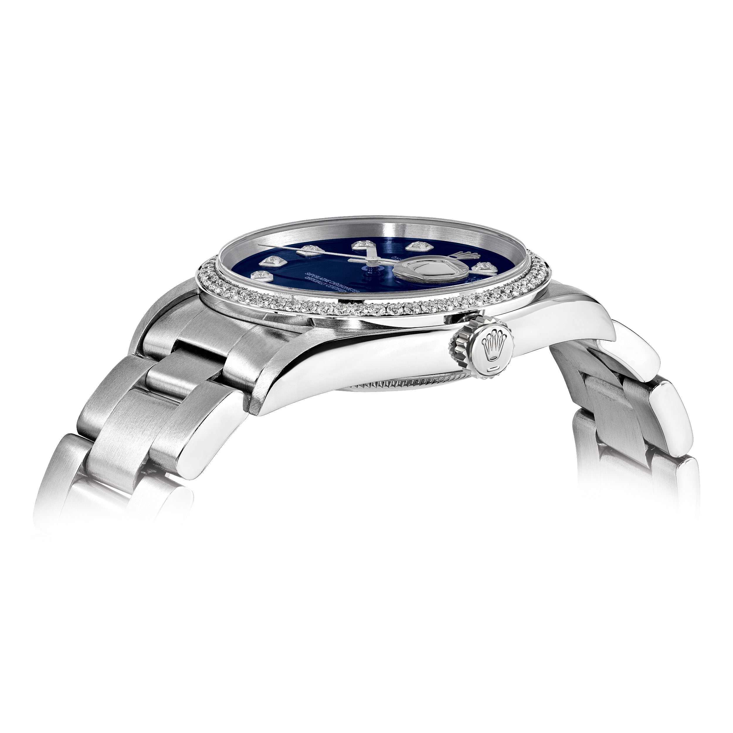 Immerse yourself in the dark beauty of this 36-mm Oyster Perpetual Datejust, featuring a luminous deep-blue dial. Its polished and brushed stainless steel jubilee bracelet, diamond hour markers, and fluted 18K white gold bezel add a hint of starlit elegance to your ensemble. A stainless steel case protects the Swiss-made automatic movement from the elements, and the watch’s quickset date function is accessible via the stainless steel screw-down crown.