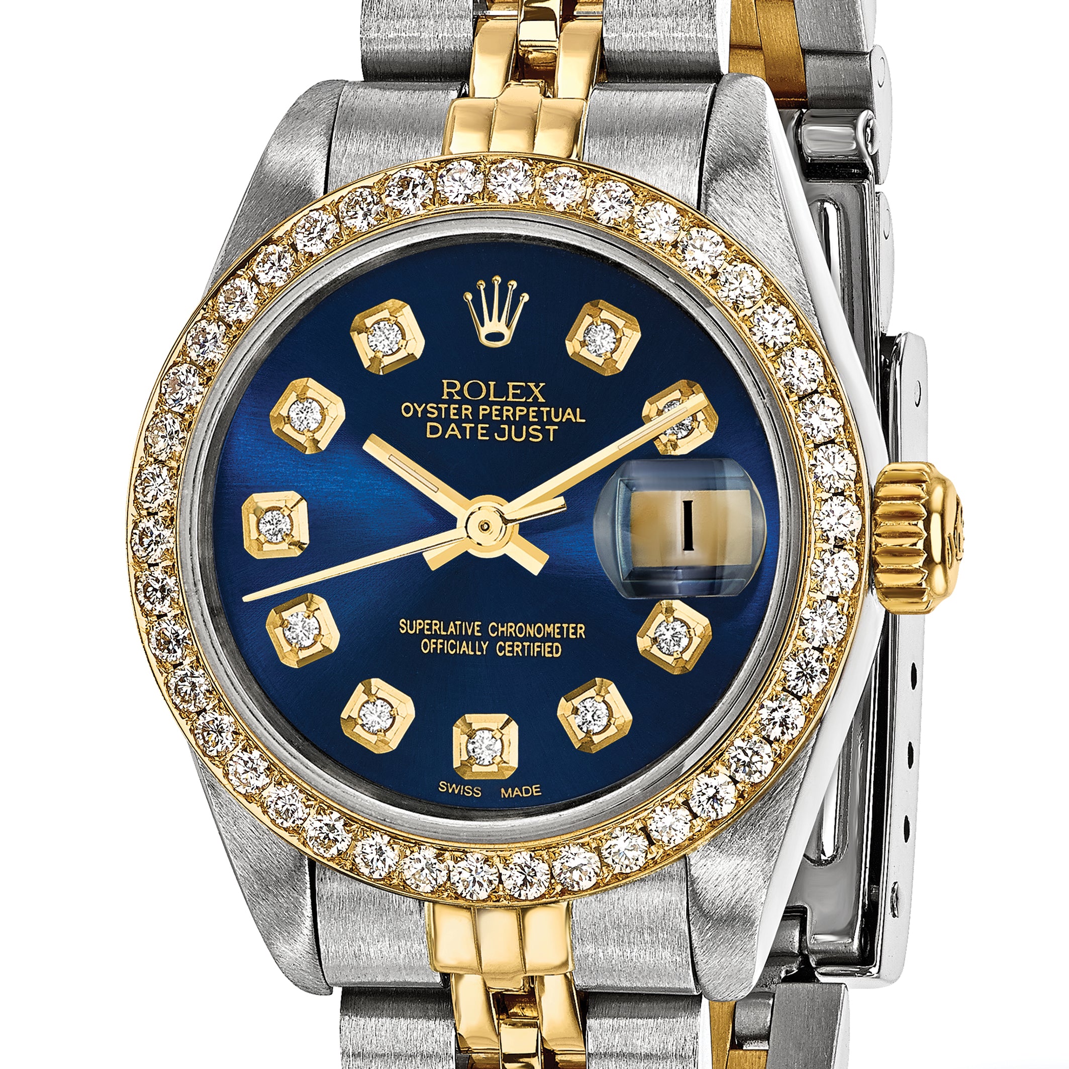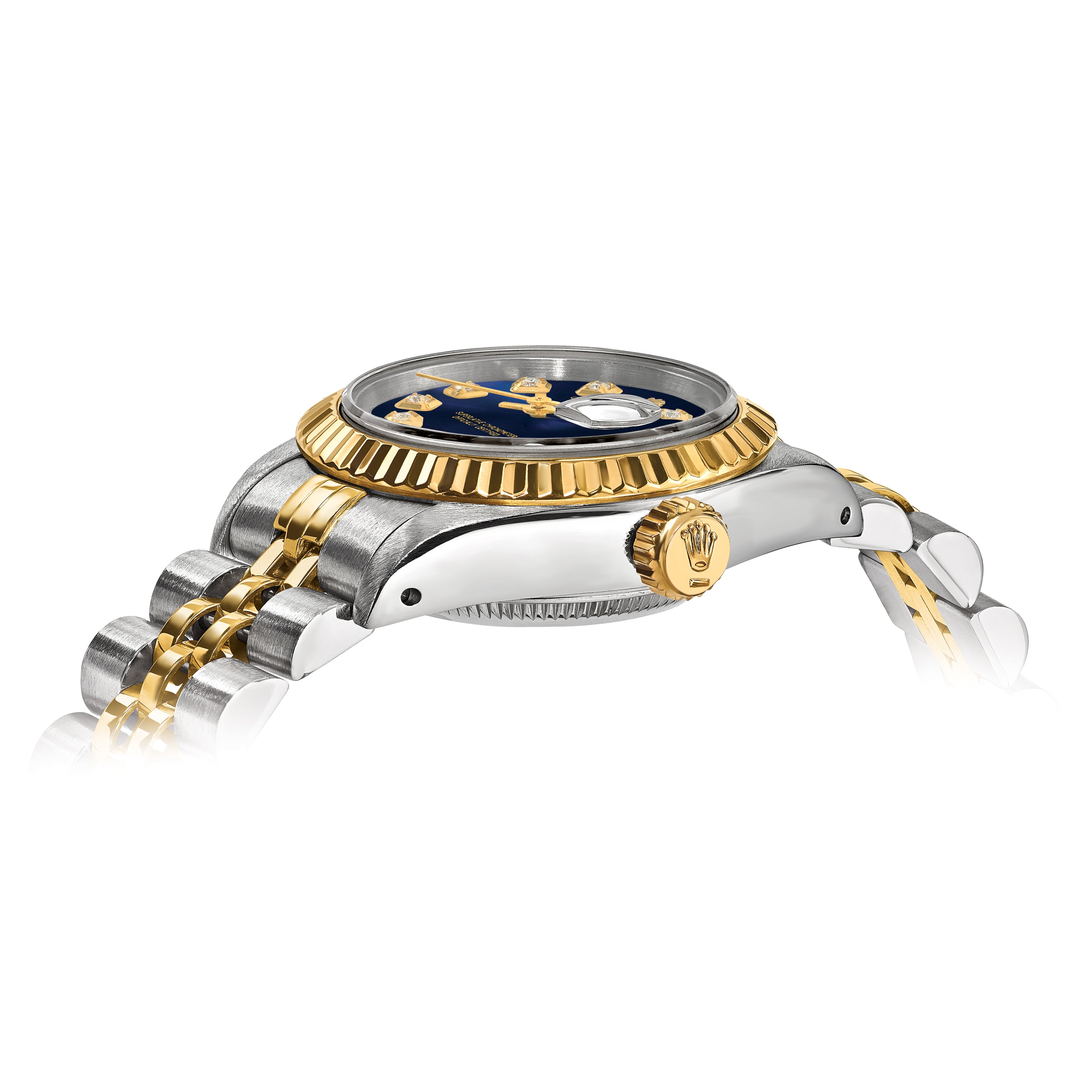This stunning 36-mm Oyster Perpetual Datejust features a jubilee bracelet in stainless steel and gold that is fastened by a fold-over clasp. Brilliant diamond hour markers and a fluted 18K yellow bezel make a celestial complement to the blue sunray-finish dial. The Swiss-made automatic movement is housed within a stainless steel case finished with an 18K yellow gold screw-down crown. Features like an easy-access quickset date function and a polished and brushed finish give this timepiece plenty of versatility, character, and style.