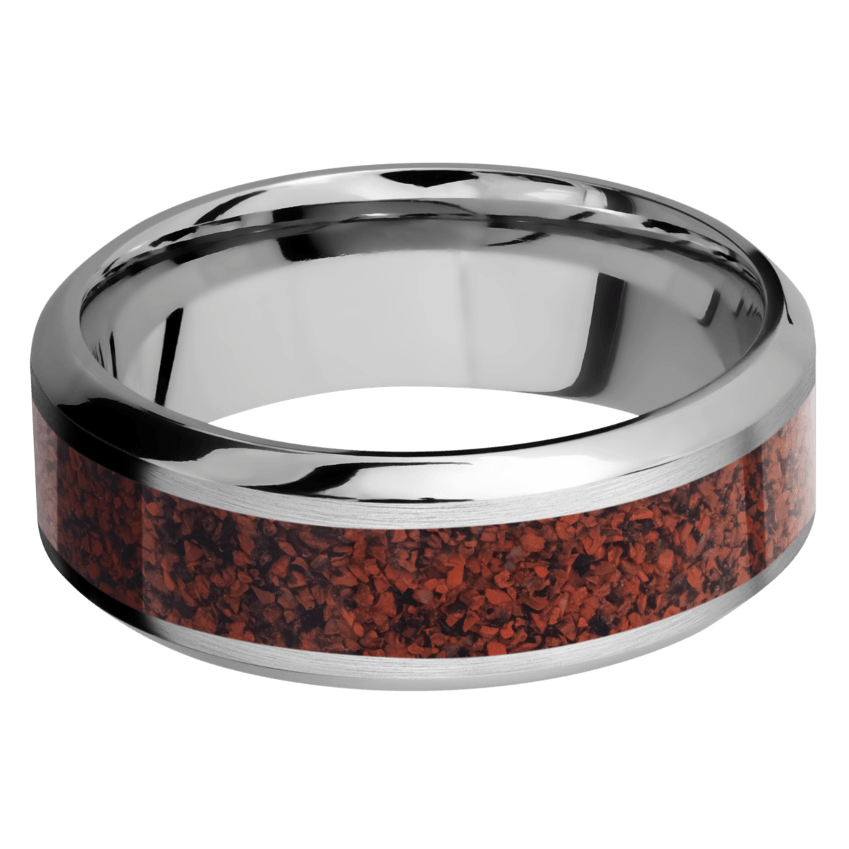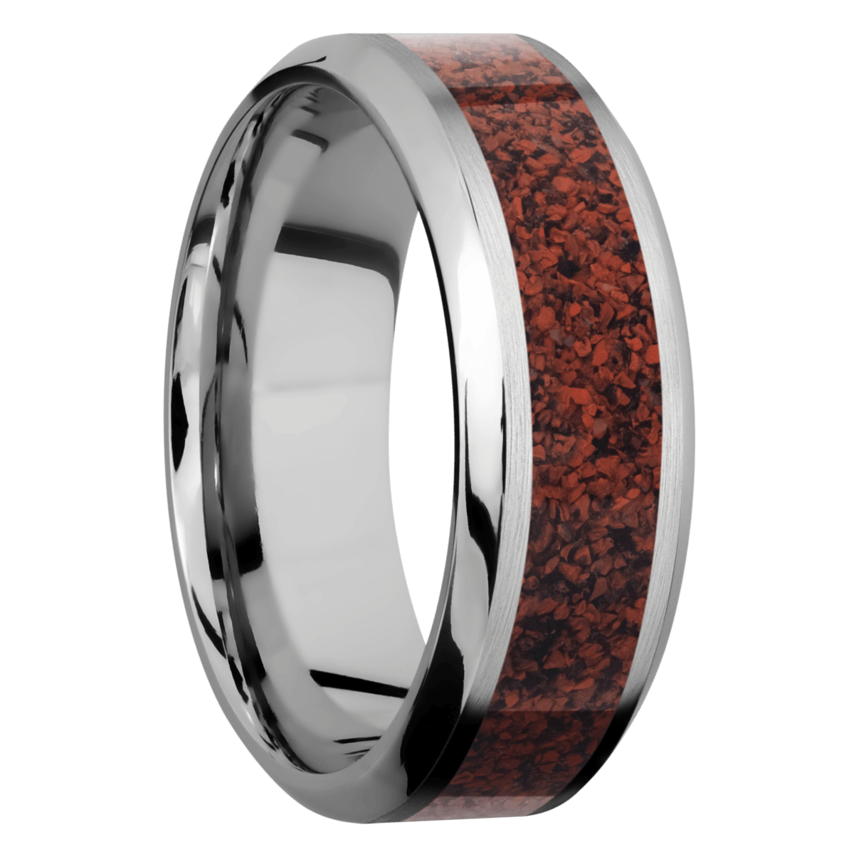 Product Description: 8mm Titanium Band With 4mm Genuine Red Dinosaur Bone.
