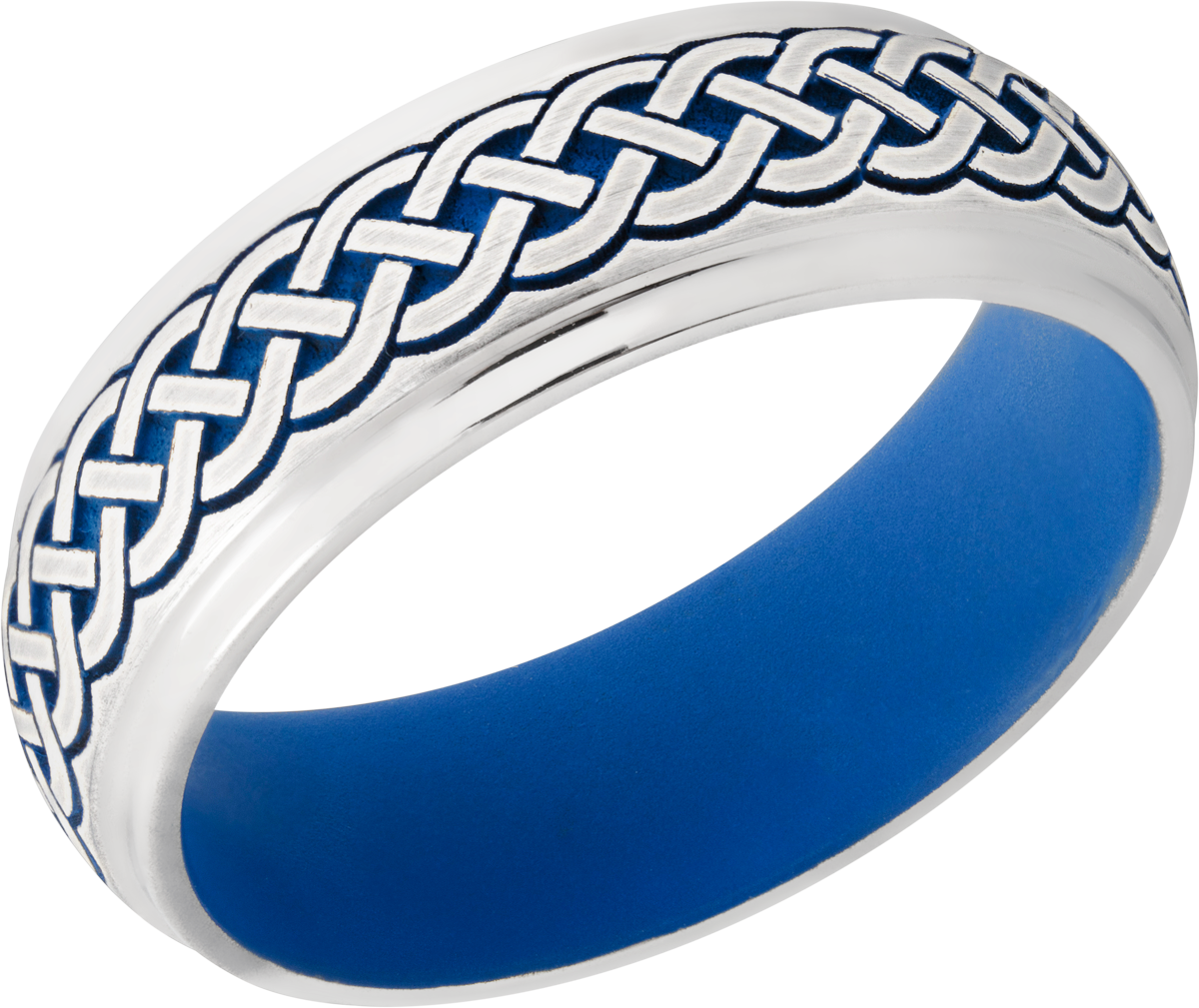 Cobalt chrome 7mm domed band with grooved edges a laser-carved Celtic pattern featuring Royal Blue Cerakote