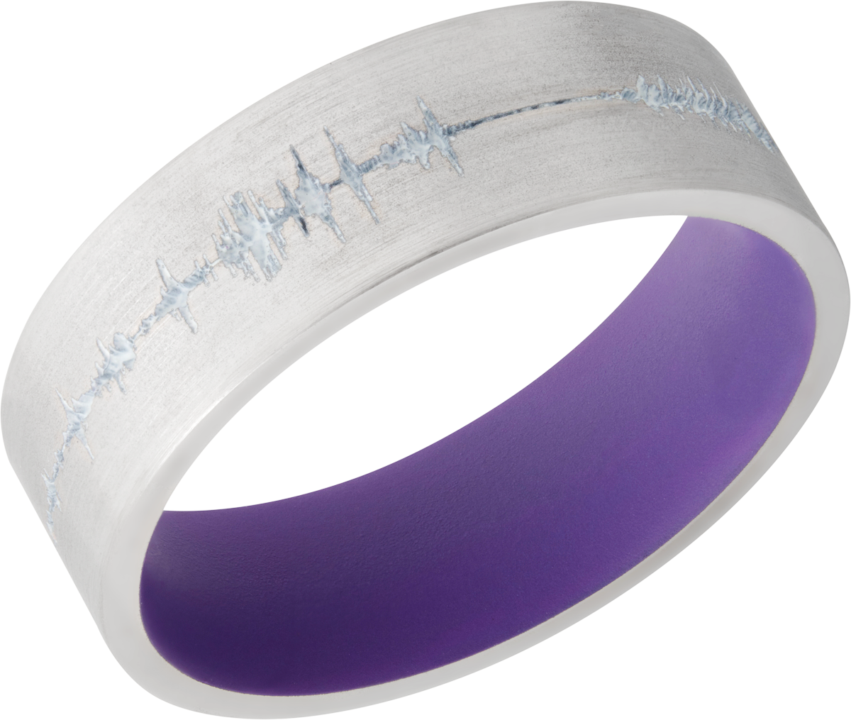 Cobalt chrome 7mm flat band with a laser-carved personalized soundwave and a Bright Purple Cerakote Sleeve