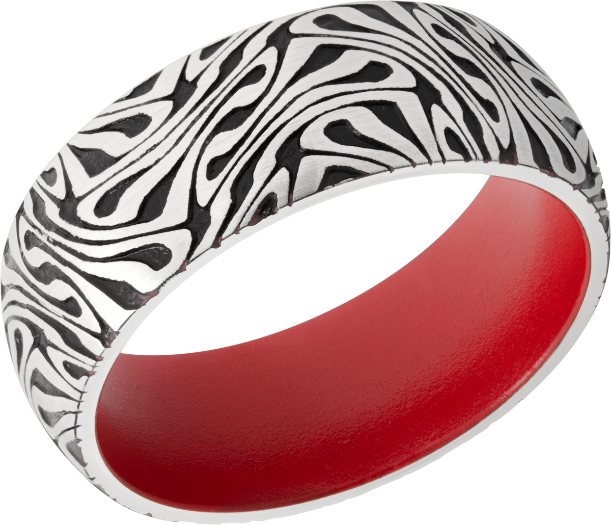 Cobalt chrome 8mm domed band with a laser-carved escher pattern featuring Black Cerakote in the recessed pattern and Red Cerakote in the sleeve