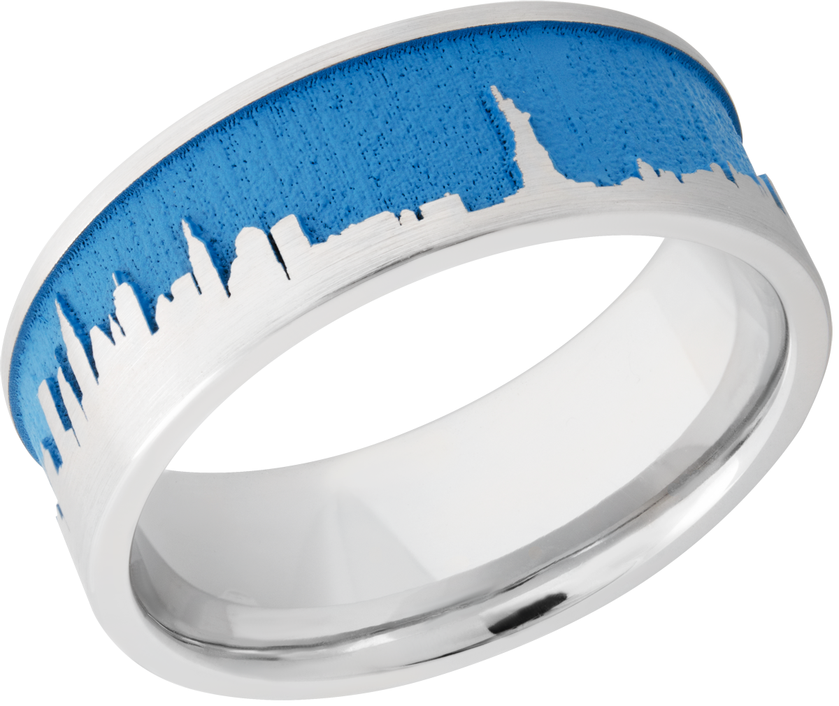 Cobalt chrome 8mm flat band with a laser-carved New York skyline featuring Sea Blue Cerakote in the recessed pattern
