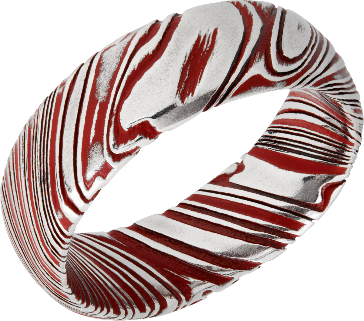 Woodgrain Damascus steel 8mm domed band beveled edges and red Cerakote in the recessed pattern