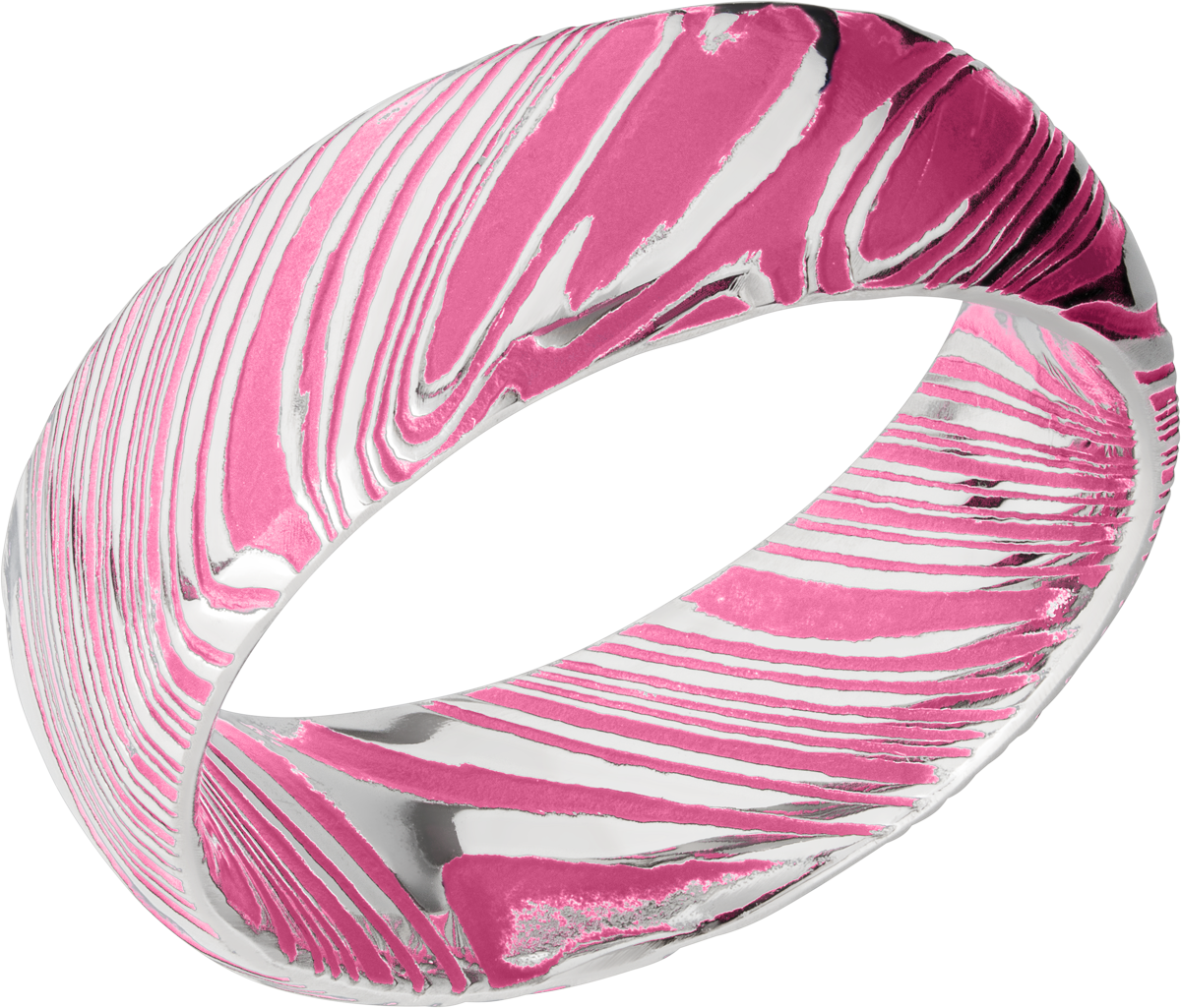 Woodgrain Damascus steel 8mm domed band beveled edges and pink Cerakote in the recessed pattern