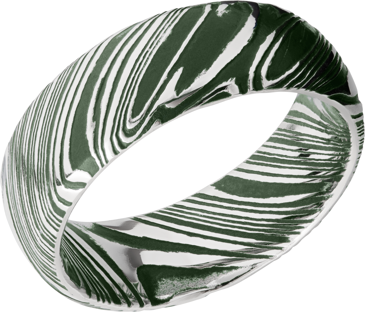 Woodgrain Damascus steel 8mm domed band beveled edges and Eastern Green Cerakote in the recessed pattern