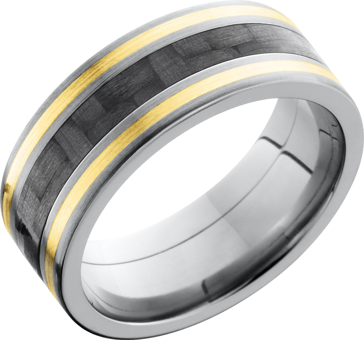 Titanium 8mm flat band with a 3mm inlay of black Carbon Fiber and 2, 1mm inlays of 14K Yellow Gold on either side