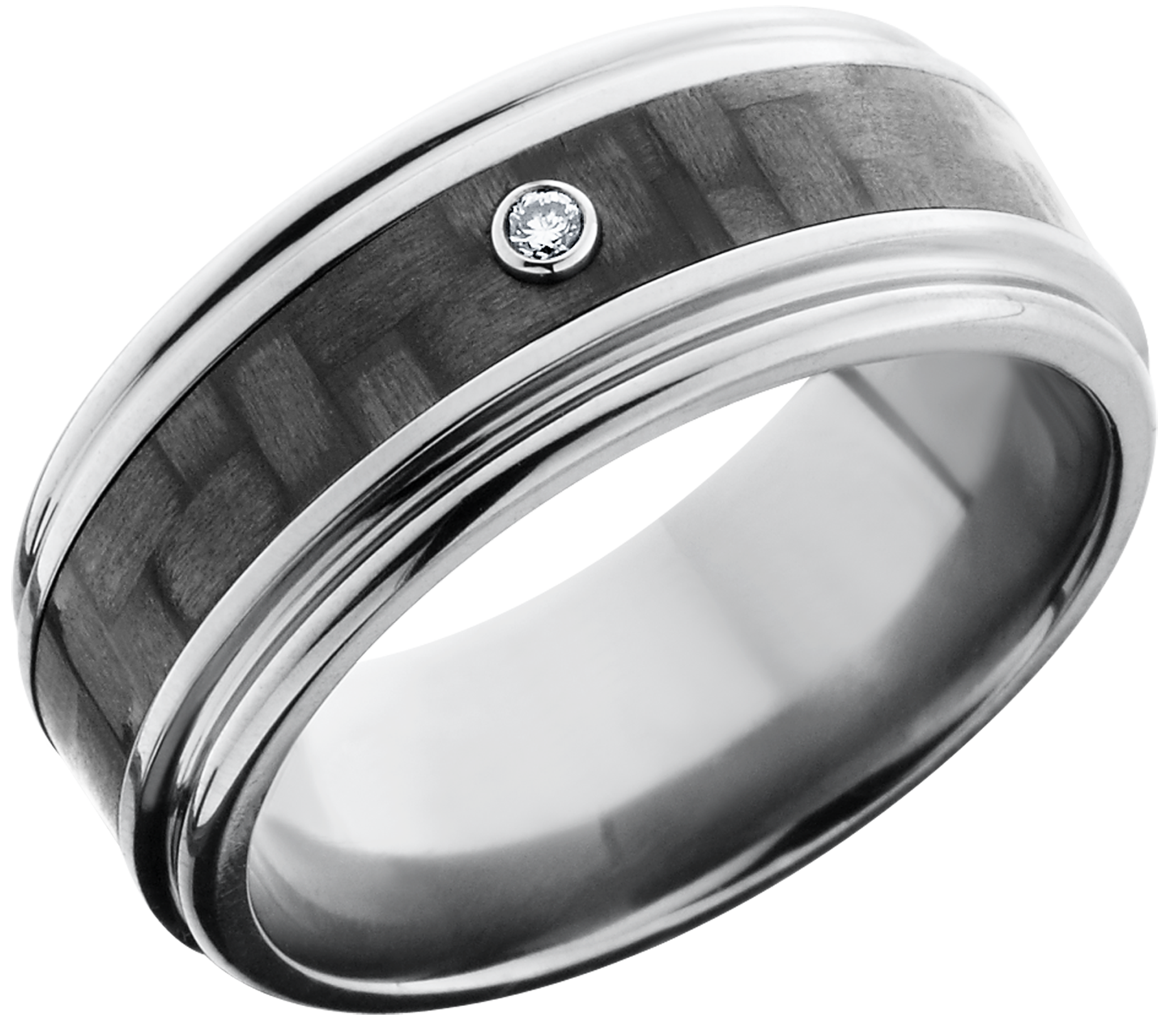 Titanium 9mm flat band with rounded edges and a 4mm inlay of black Carbon Fiber with a bezel-set white diamond accent
