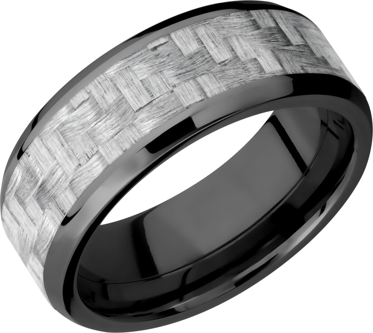 Zirconium 8mm beveled band with a 5mm inlay of silver Carbon Fiber