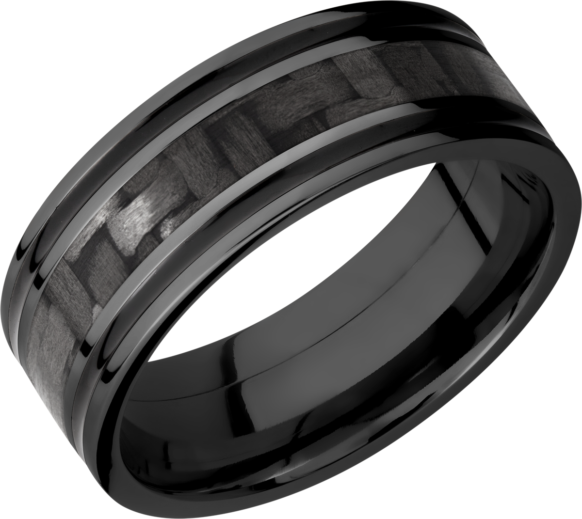 Zirconium 8mm flat band with a 3mm inlay of black Carbon Fiber and 2, 1mm inlays of Cerakote