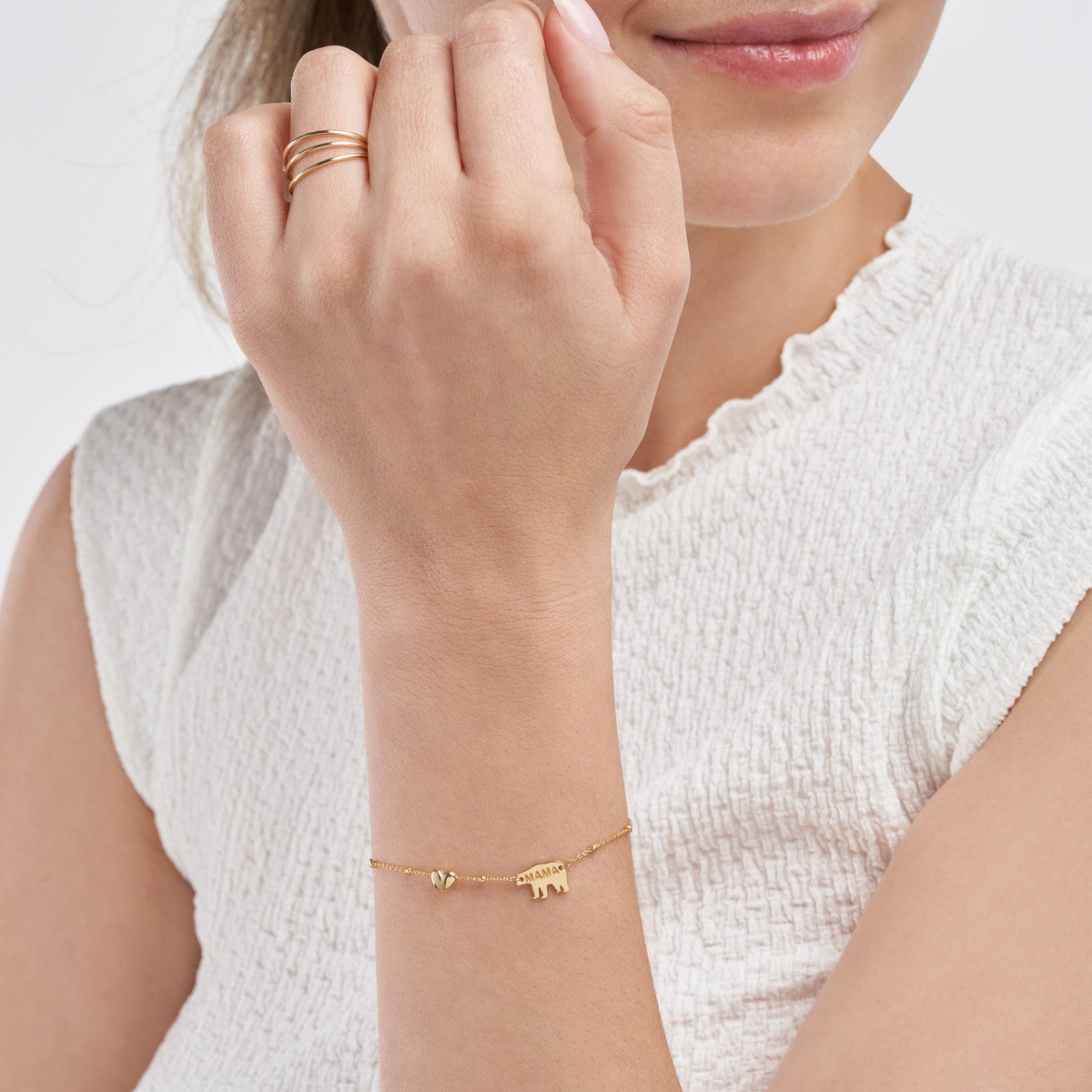 Share your love for Mom with our Mama Bear and Puffed Heart Bracelet. Made in 14K gold on a Saturn Bead Bracelet chain with a 1 inch adjuster.