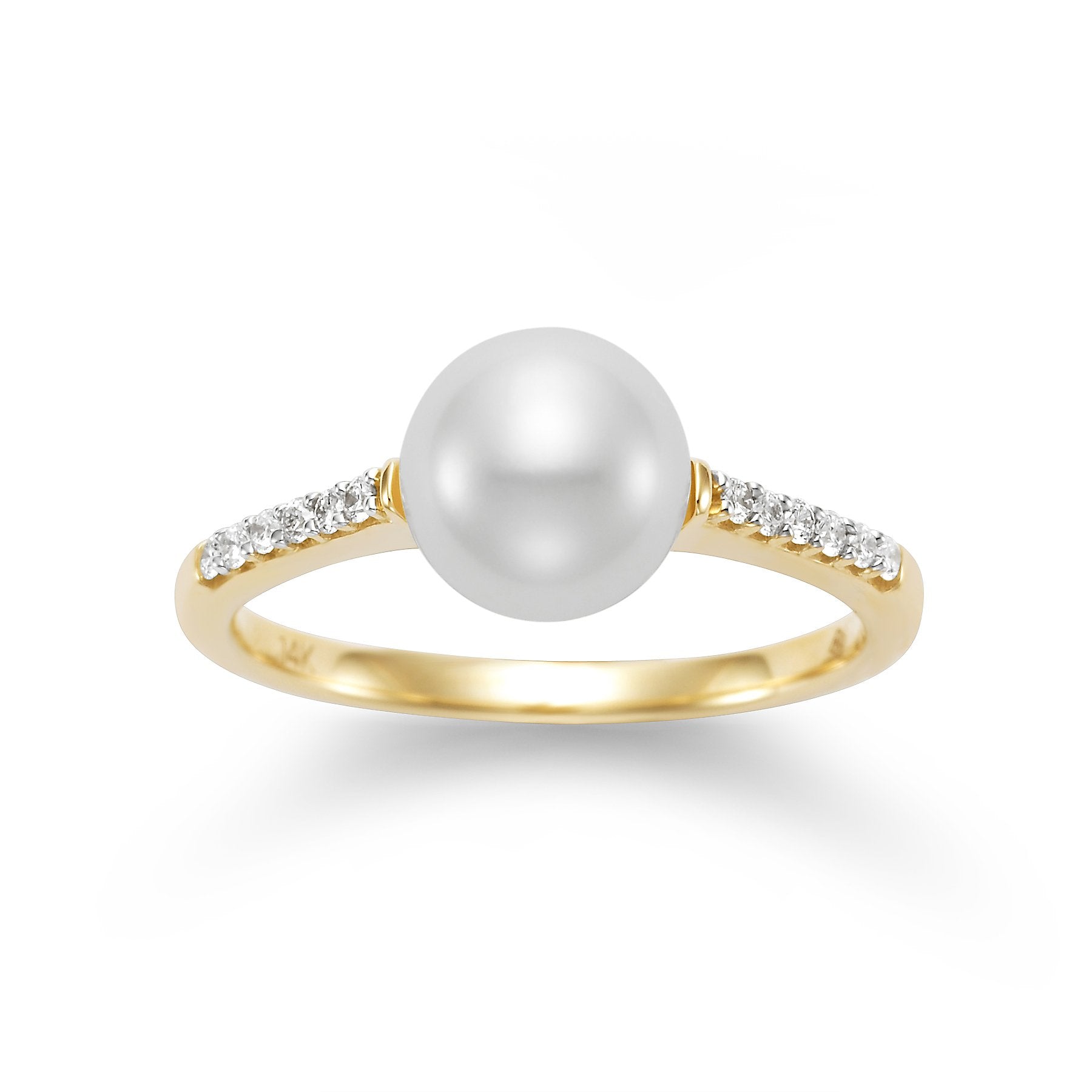 This lovely Classic Ring is a 14KT Yellow Gold 7.5-8MM White Freshwater Pearl Ring with 12 Diamonds 0.10 TCW and is apart of our Mastoloni Collection. Our Mastoloni collection of jewelry includes bracelets, rings, necklaces, and earrings.