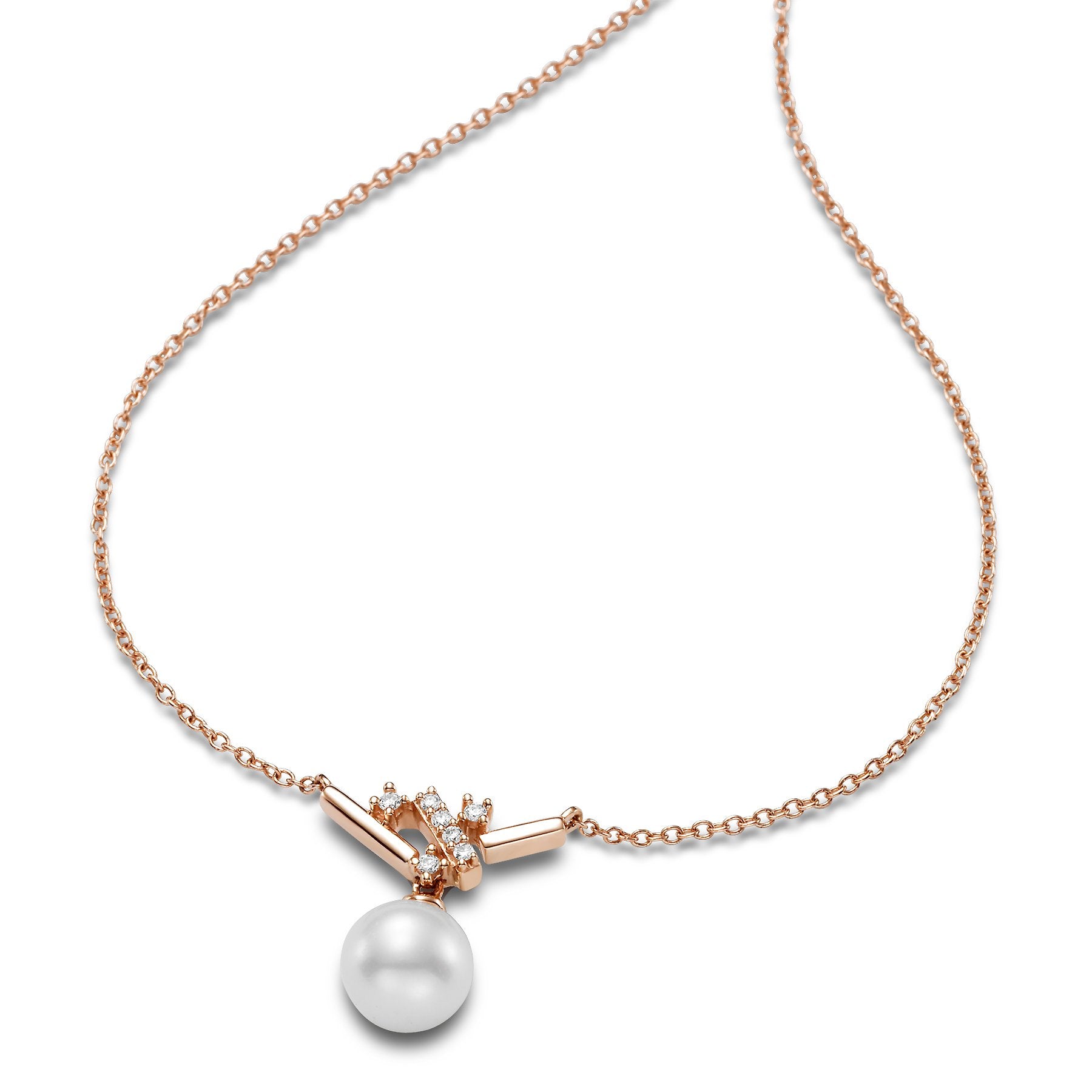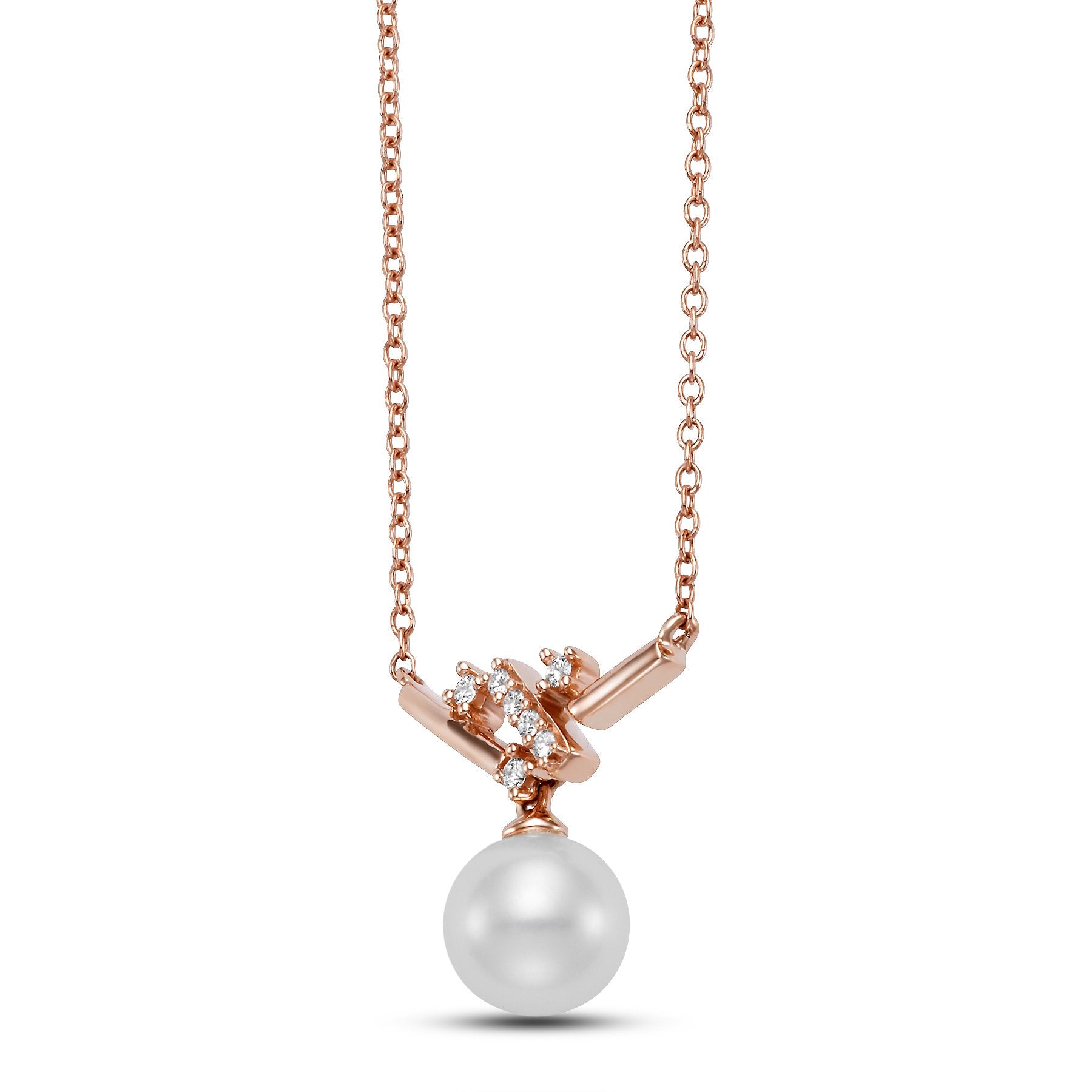 This lovely Geo Pendant Necklace is a 14KT Rose Gold 6.5-7MM White Freshwater Pearl Necklace with 7 Diamonds 0.15 TCW, 18 Inches and is apart of our Mastoloni Collection. Our Mastoloni collection of jewelry includes bracelets, rings, necklaces, and earrings.